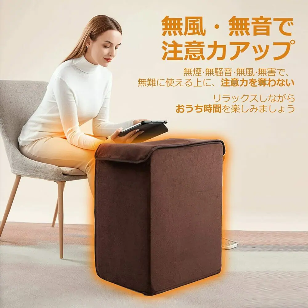 本製品は、わずか100Wの低電力で足元を温めることのできる電気足温器である。温風を吹きつけるエアコン等とは異なり、無風で温めることが出来るため乾燥の心配がない。