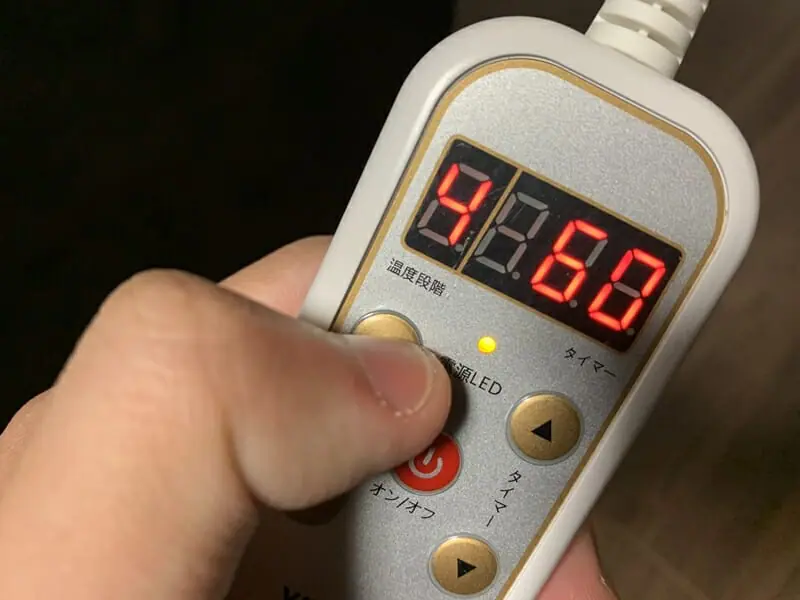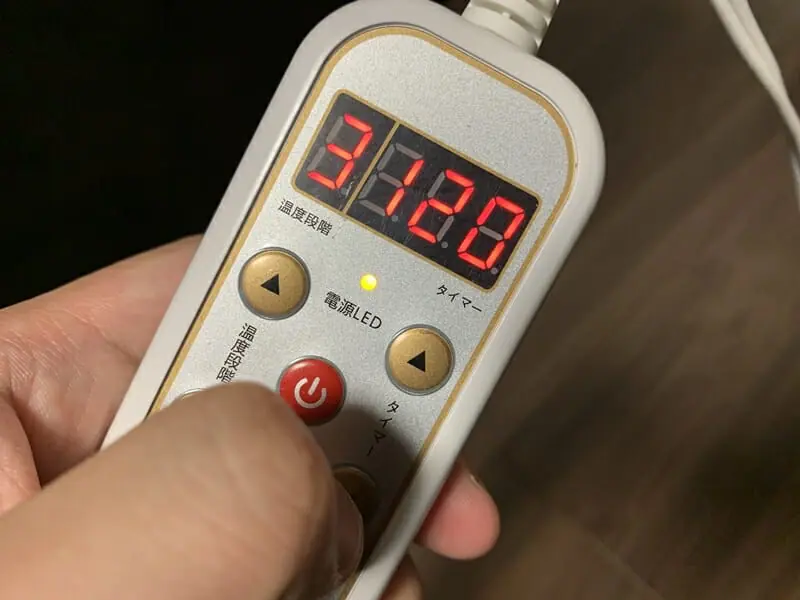 リモコン中央の電源ボタンを押すことでLEDランプが点灯し、パネルヒーターが発熱を開始する。