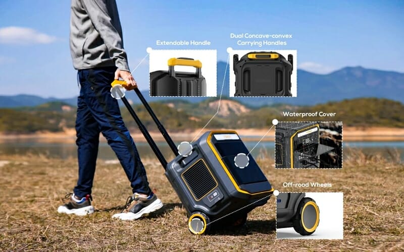 後部に車輪の付いたスーツケース型の電源であり、2,816Whという驚異的なバッテリー容量を実現。2基の拡張バッテリーを接続することで最大8,448Whまでの拡張も可能であり、非常用電源としても十分活躍できるポータブル電源だ。