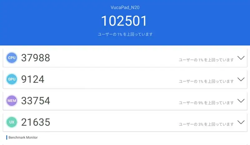 本製品『VUCATIMES N20』について、AnTuTuベンチマークテストを実施した結果は以下の通り。