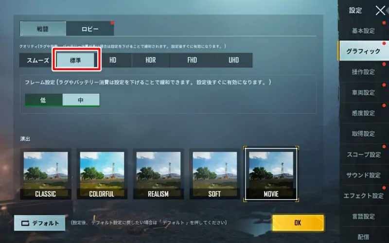 グラフィック設定では、クオリティを『標準』まで指定できた。