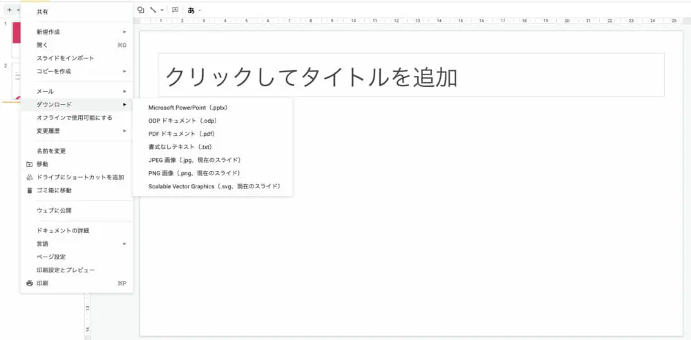 また、ファイル⇨ダウンロードよりPowerPointファイルやPDFファイル等に出力することもできます。