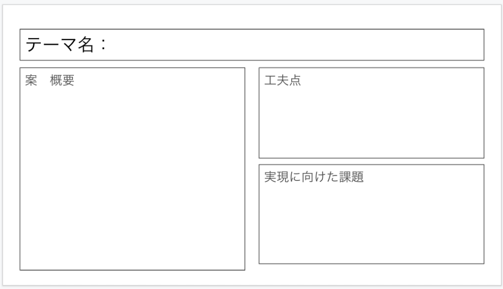 上図のように事前にワークシートを作成し書き込んでいく形式にすると、参加者が内容を考えやすいためオススメです。