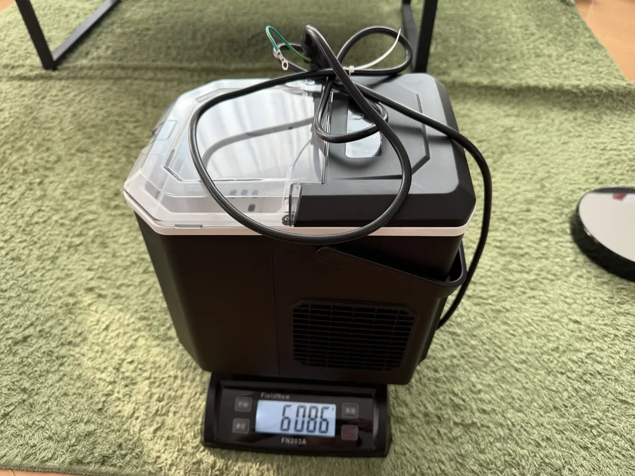 本体重量は実測で約6kg(製氷バスケット含む)。子供やお年寄りでも問題なく持ち運べる重さです。