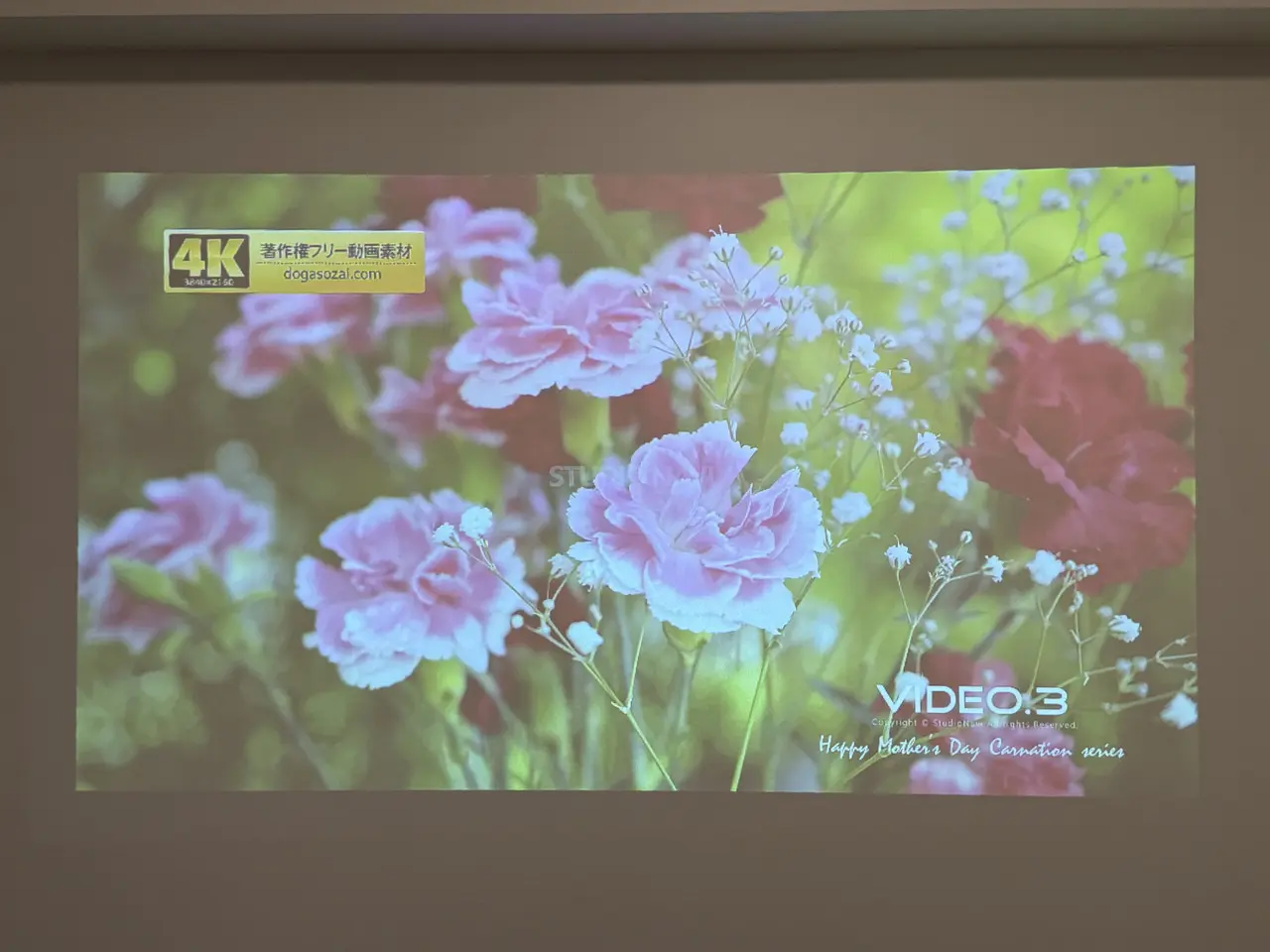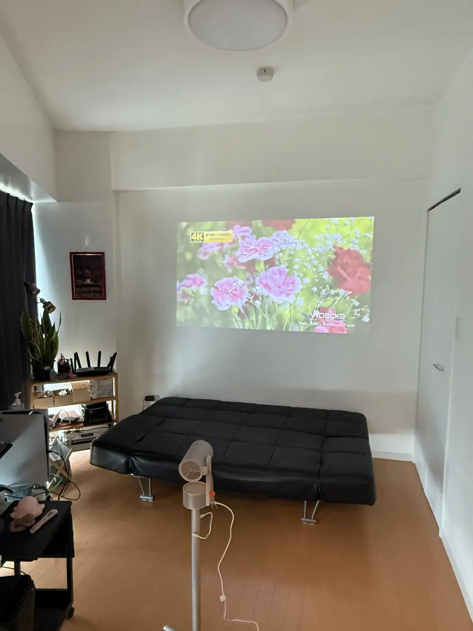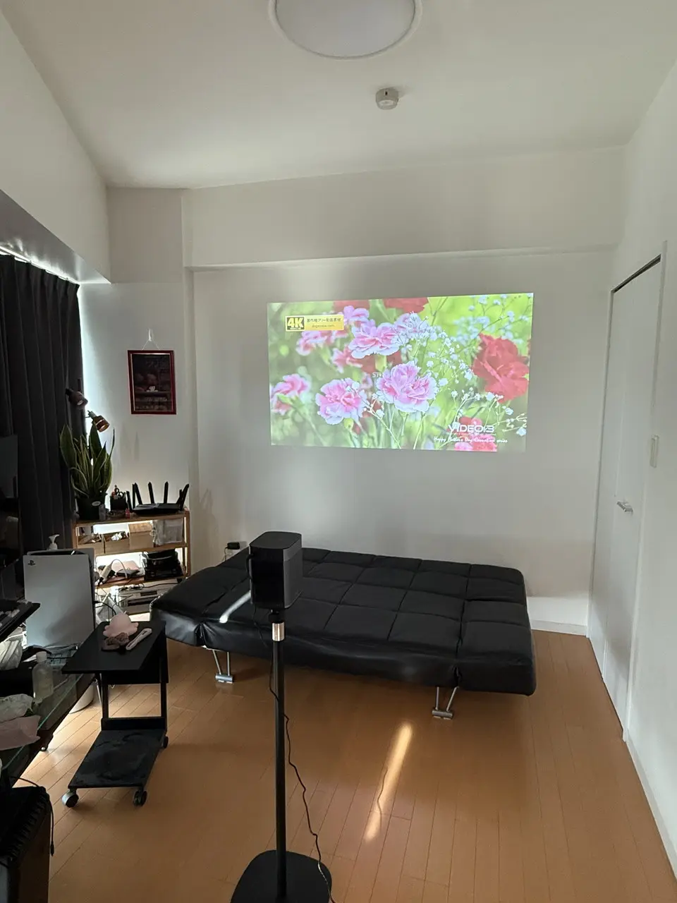 今回のレビューでは、白い壁面から約2mほど離し、約80インチの投影サイズでプロジェクターを利用しました。