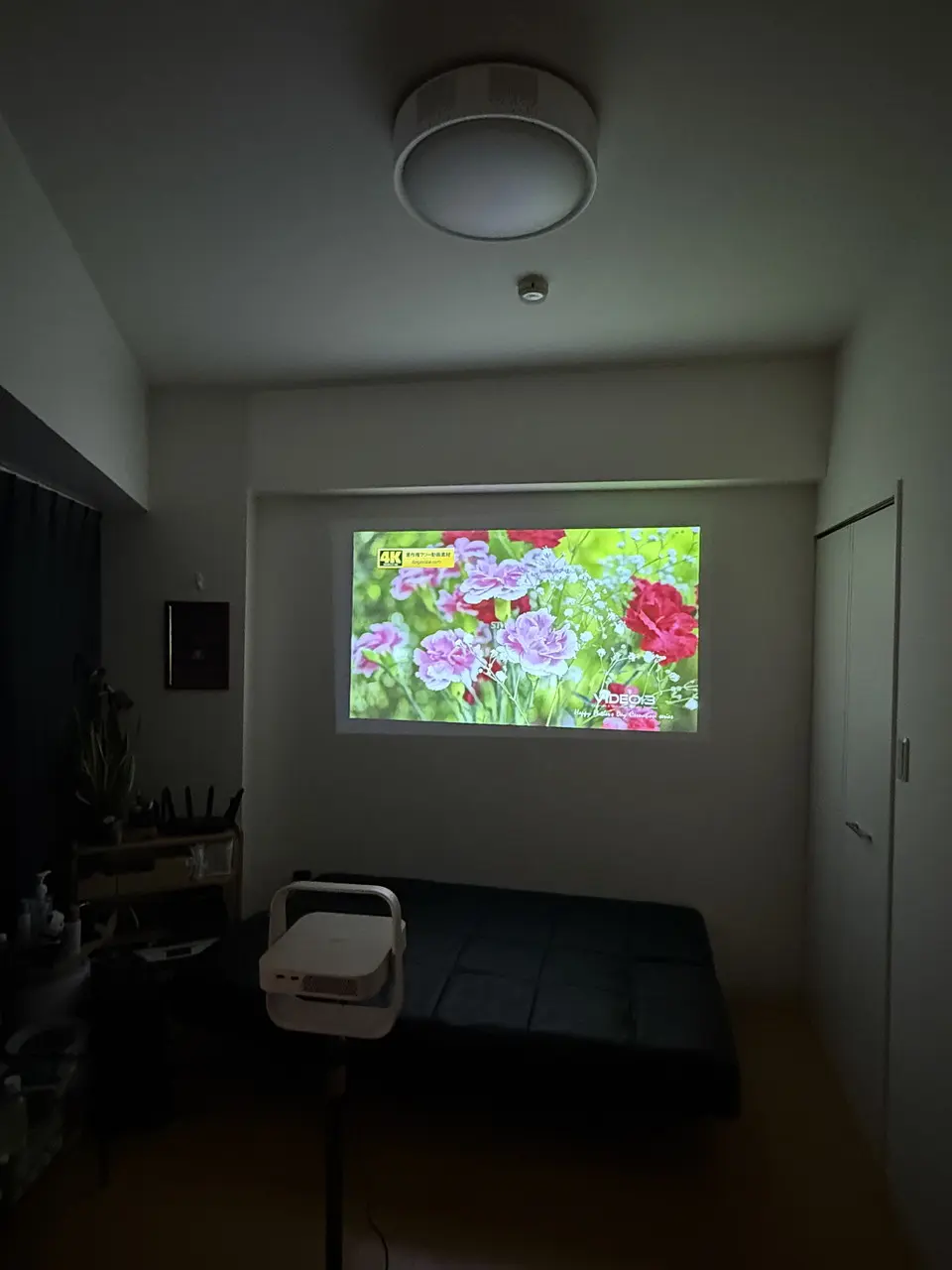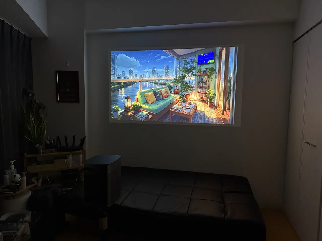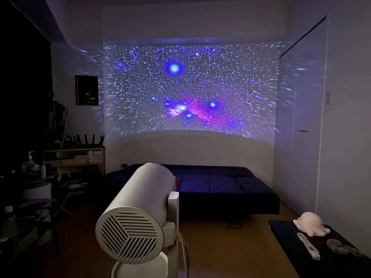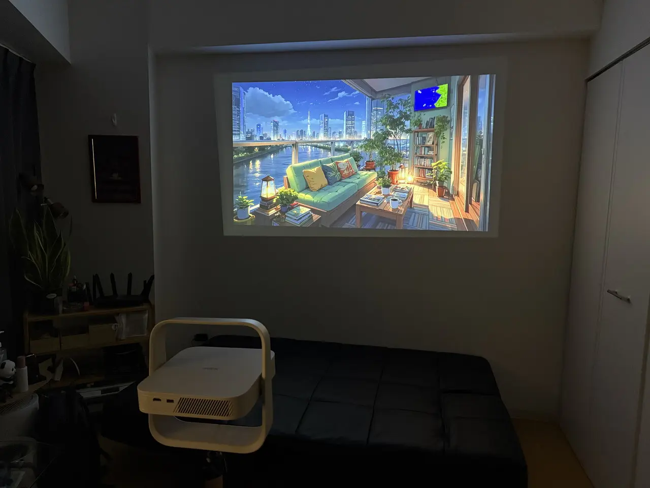本体部分を大きく傾けることで、ベッドに寝転びながら天井に大画面を投影でき、寝室での映画やアニメ視聴に最適。明るさは400 ISOルーメンとHalo+(New)に劣りますが、暗所であれば十分鮮明な映像を楽しめます。