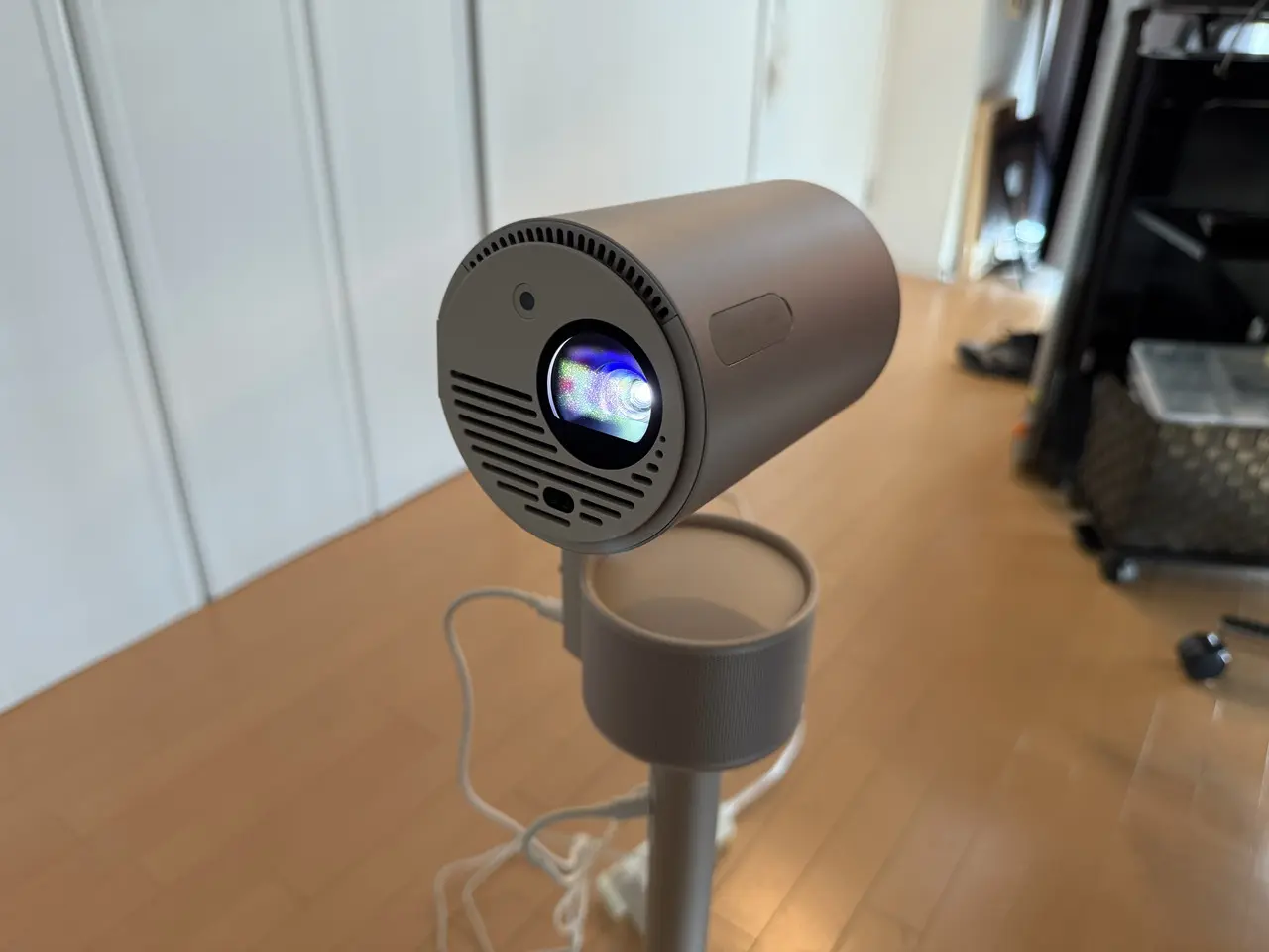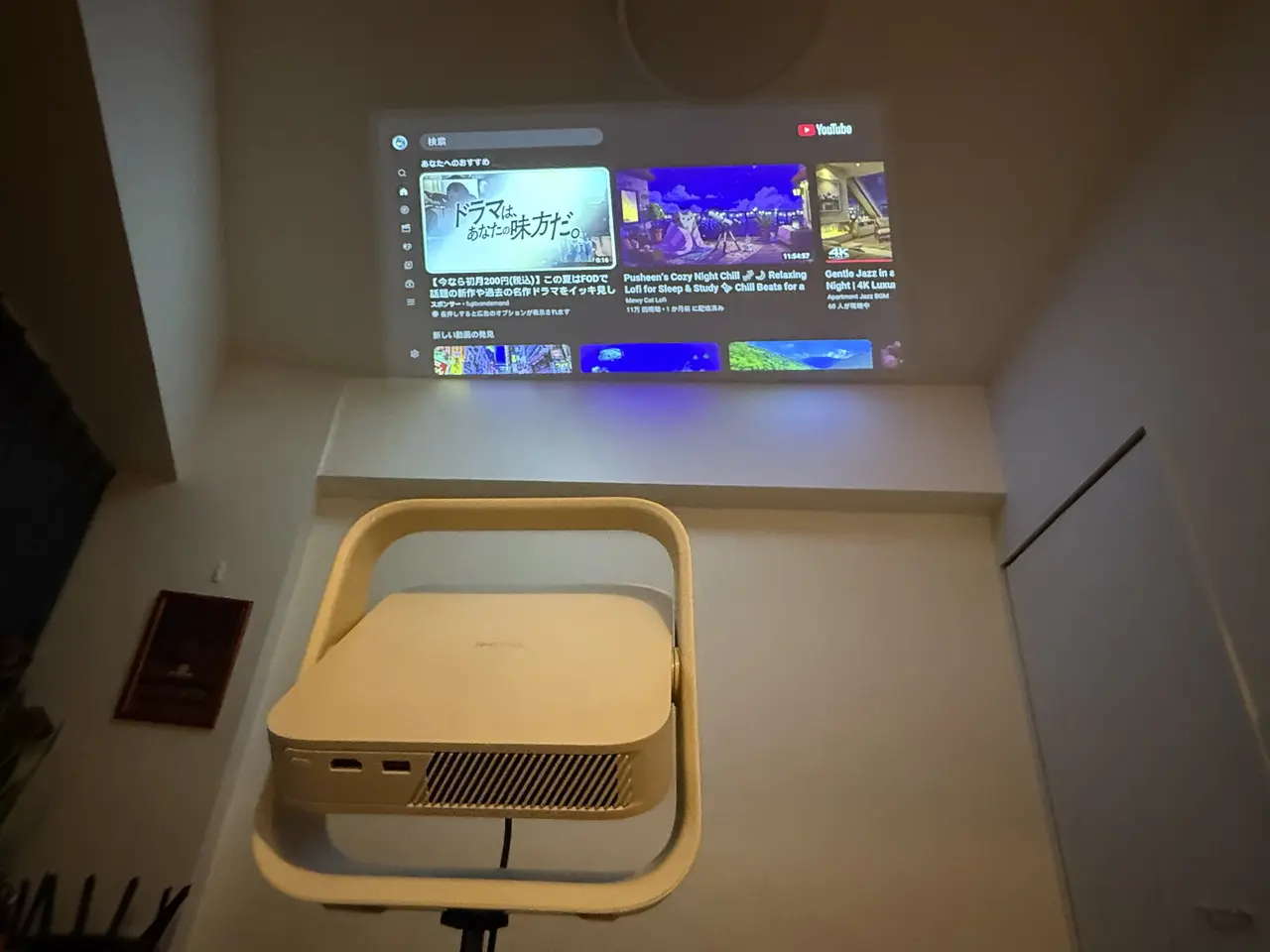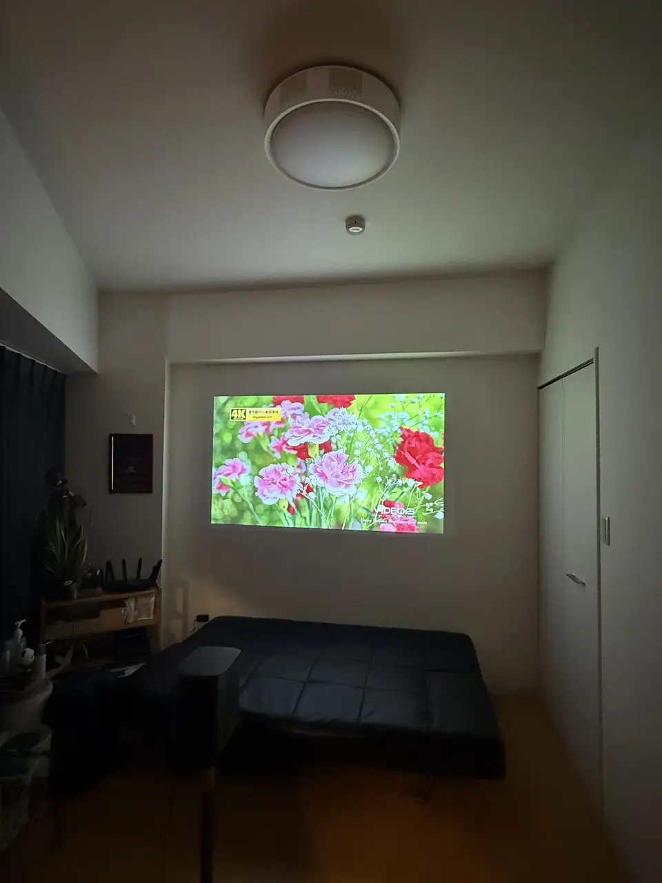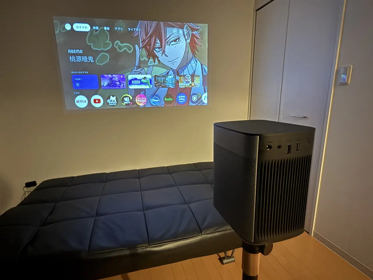 本体部分を大きく傾けることで、ベッドに寝転びながら天井に大画面を投影でき、寝室での映画やアニメ視聴に最適。明るさは400 ISOルーメンとHalo+(New)に劣りますが、暗所であれば十分鮮明な映像を楽しめます。