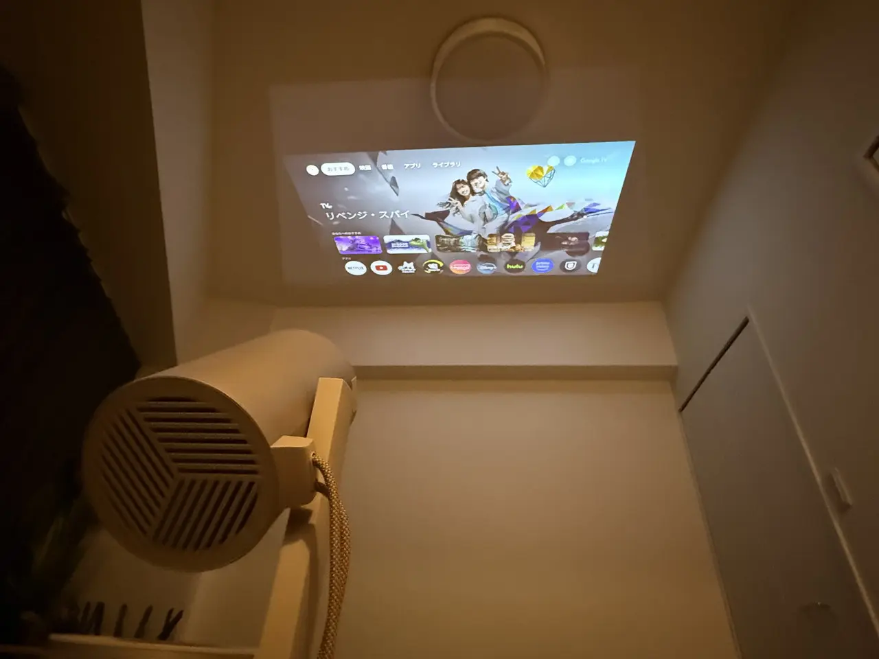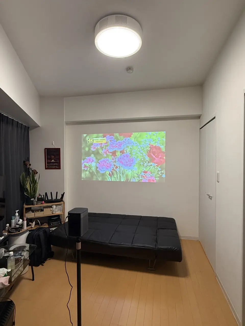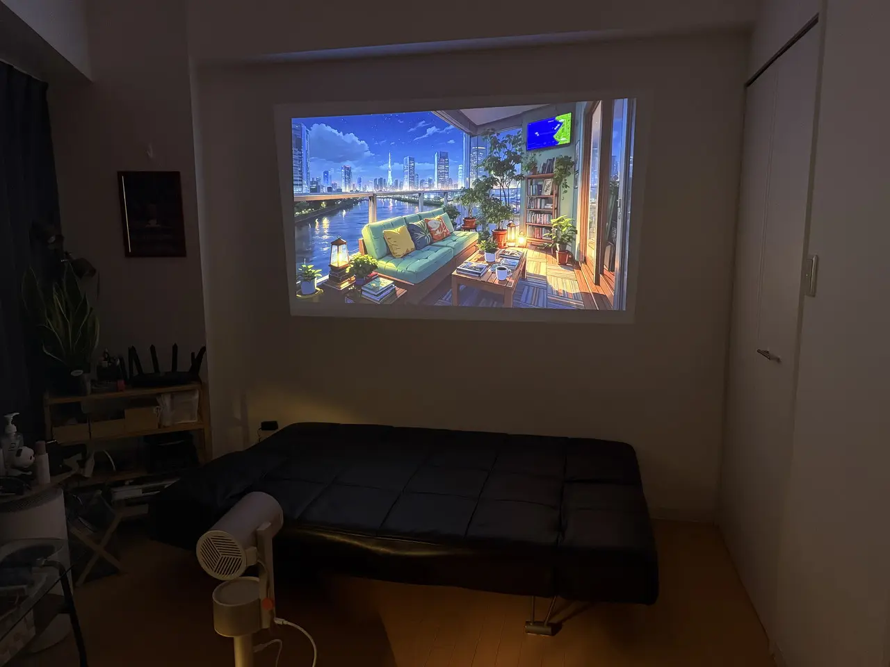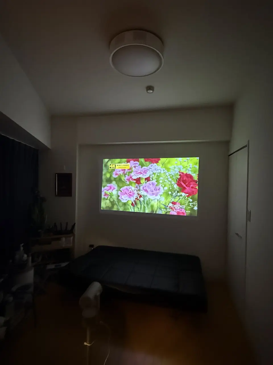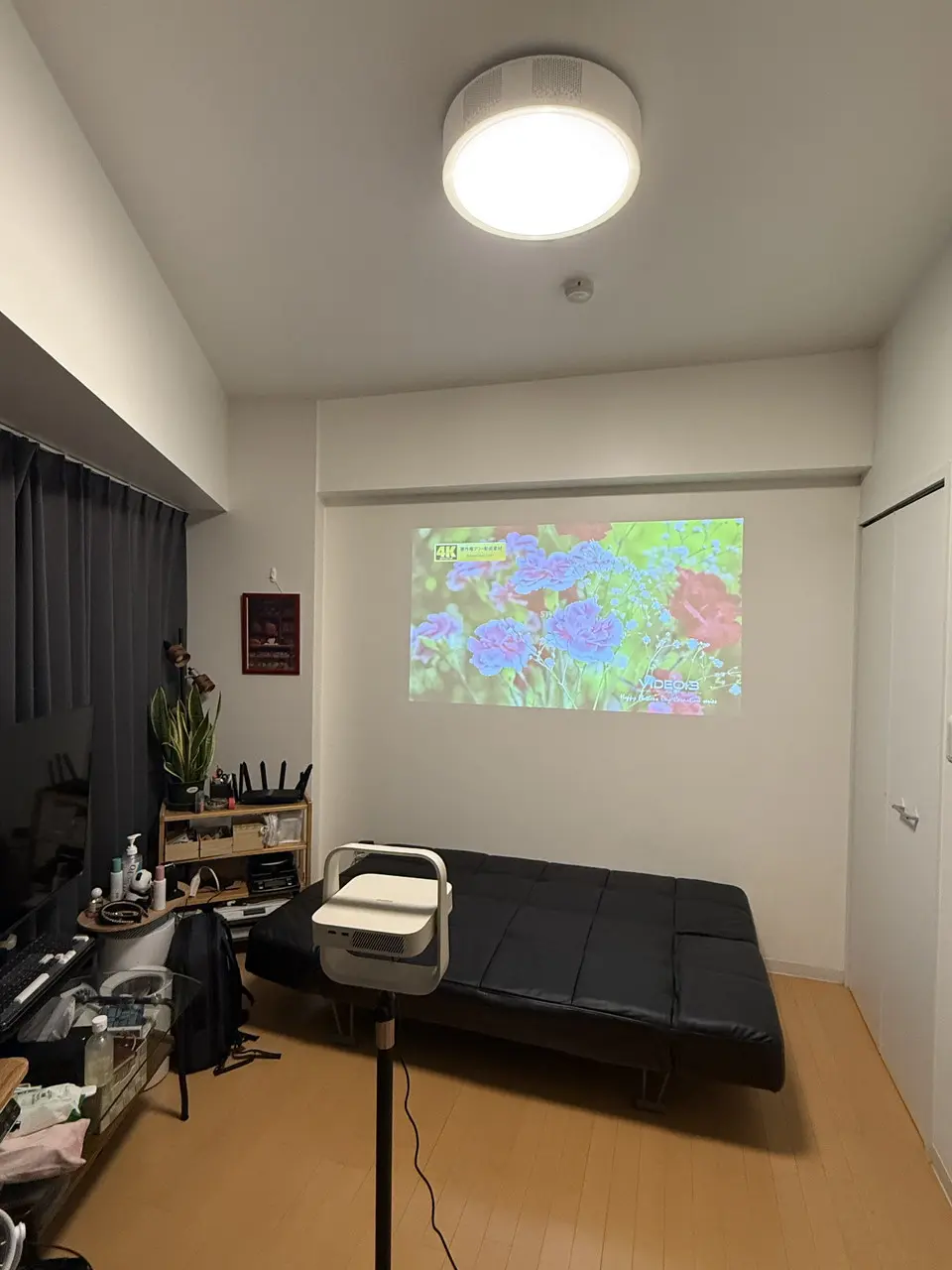 本体部分を大きく傾けることで、ベッドに寝転びながら天井に大画面を投影でき、寝室での映画やアニメ視聴に最適。明るさは400 ISOルーメンとHalo+(New)に劣りますが、暗所であれば十分鮮明な映像を楽しめます。