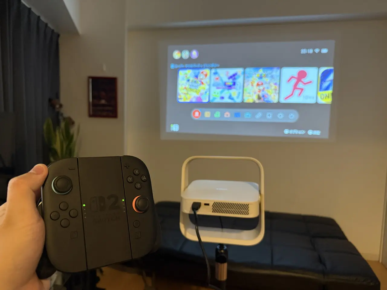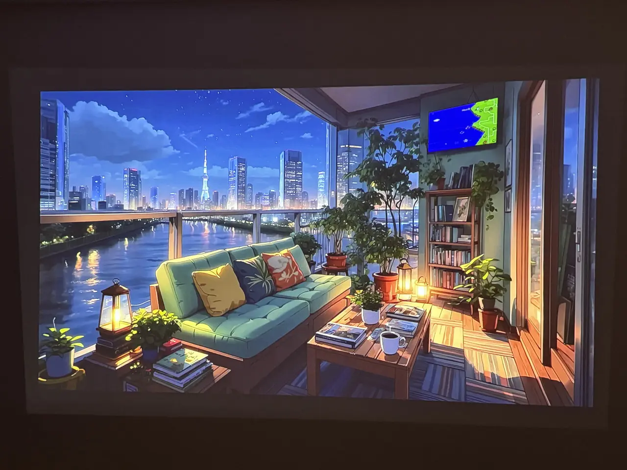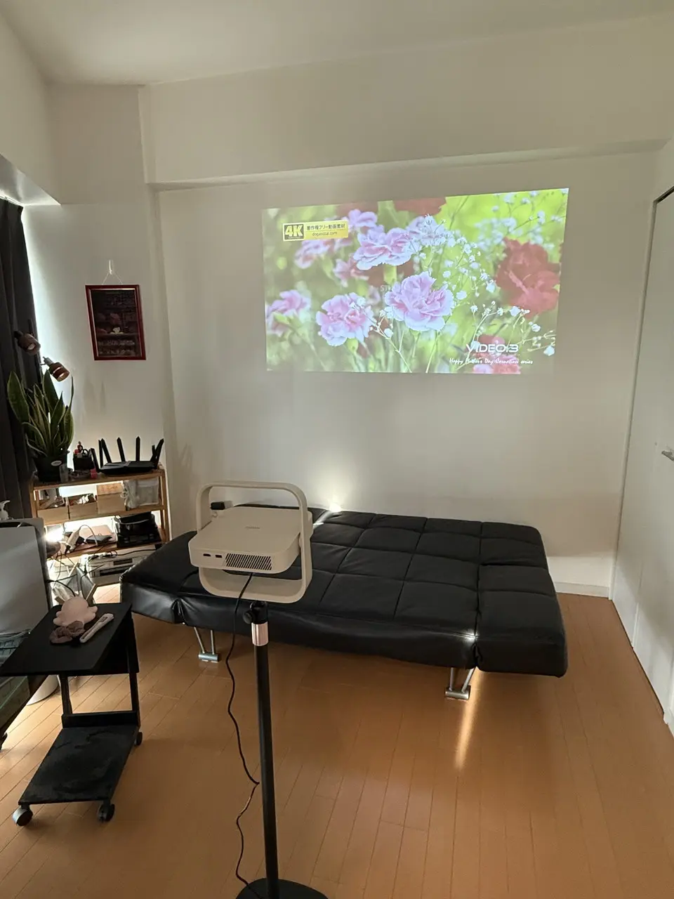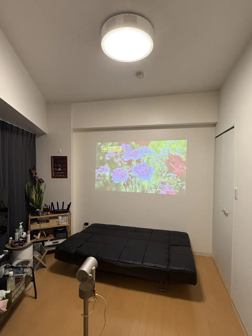 本体部分を大きく傾けることで、ベッドに寝転びながら天井に大画面を投影でき、寝室での映画やアニメ視聴に最適。明るさは400 ISOルーメンとHalo+(New)に劣りますが、暗所であれば十分鮮明な映像を楽しめます。