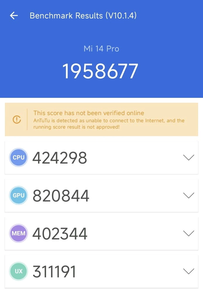 以前レビューした『Xiaomi 13 Ultra』が約125万点を記録したのに対し、『Xiaomi 14 Pro』はさらに70万点も上回る、約195万点という驚異的なスコアを記録した。
