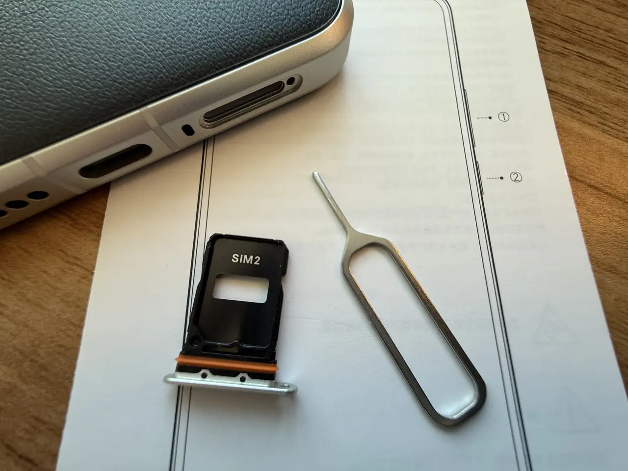 ▼付属のピンでスロットを開き、デュアルSIMカードの挿入が可能。マイクロSDカードの挿入には対応していない。