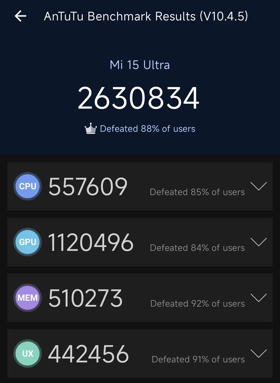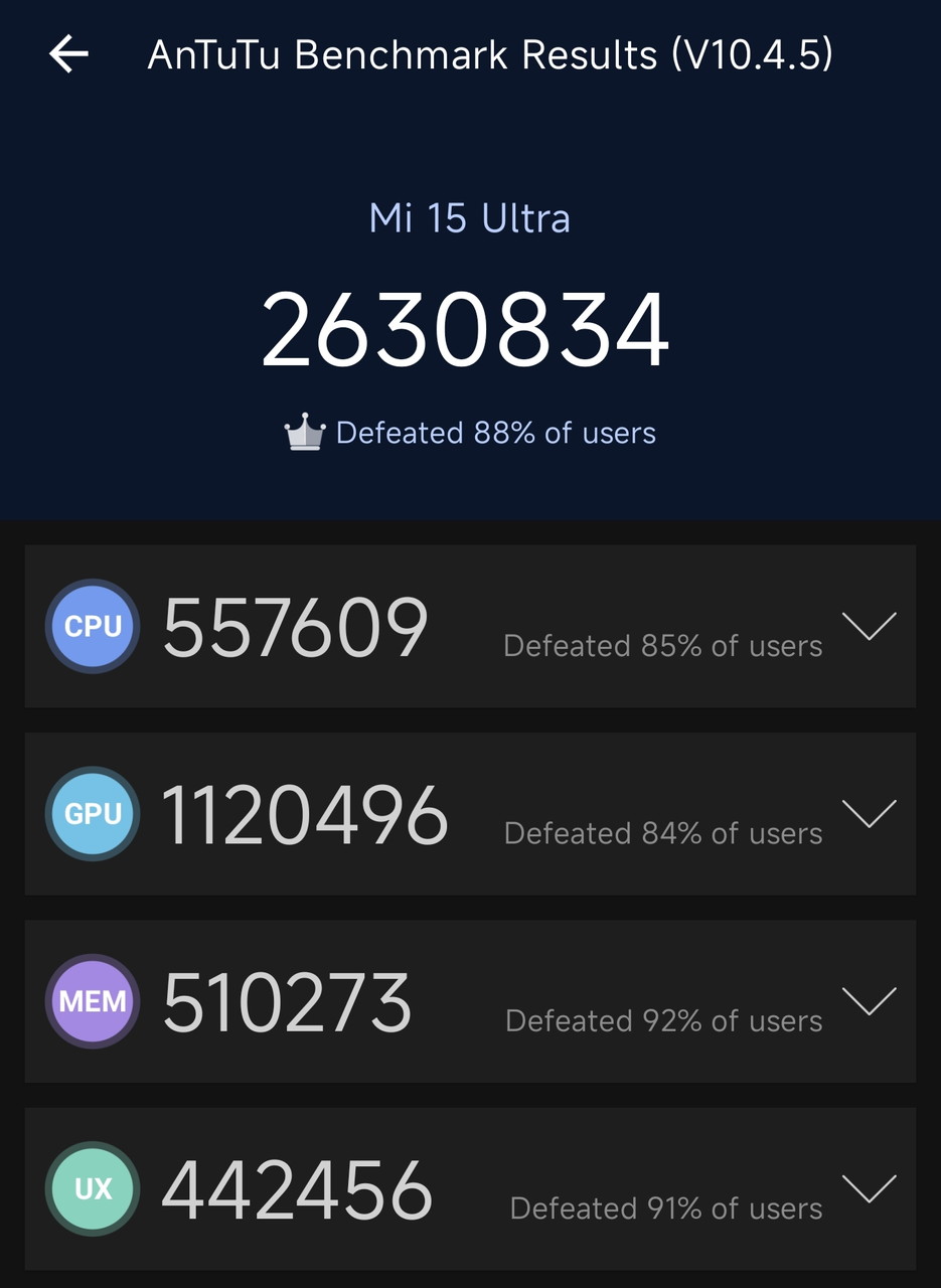 『Xiaomi 15』および『Xiaomi 15 Ultra』はいずれもSnapdragon® 8 Eliteを搭載したウルトラハイエンド級のモデルであり、AnTuTuベンチマークにおいて250万点~300万点近い高スコアを記録する、卓越したパフォーマンスを提供する。