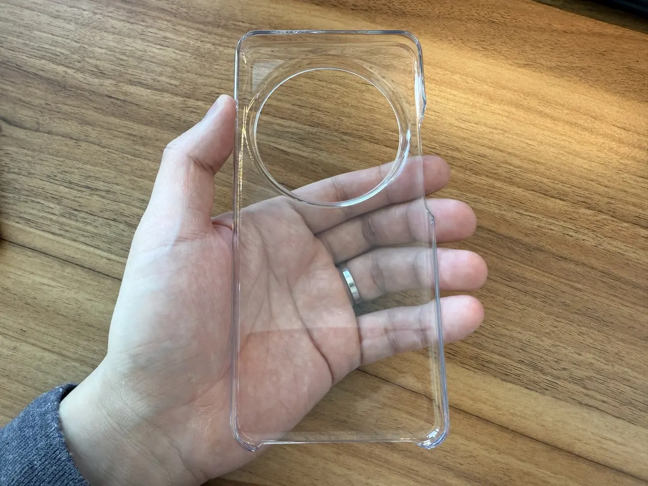 ▼透明なスマホケースも付属。プラスチック製で硬く、装着にやや苦労する。品質的には最低限のものだ。