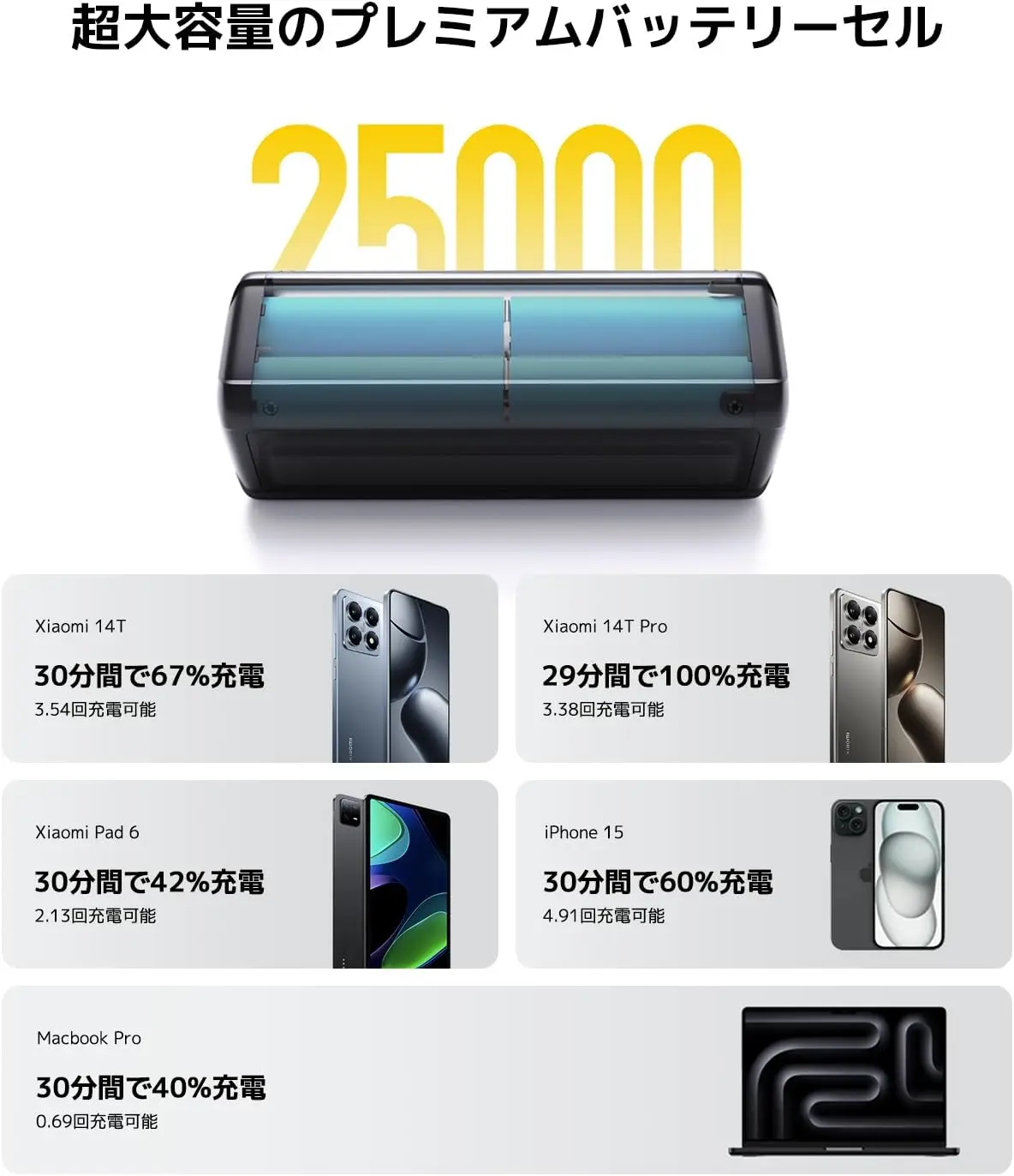 『Xiaomi 212W HyperCharge Power Bank 25000mAh』は、25,000mAhの大容量セルを内蔵したモバイルバッテリーです。5,000mAhのバッテリーセルを5個搭載しています。