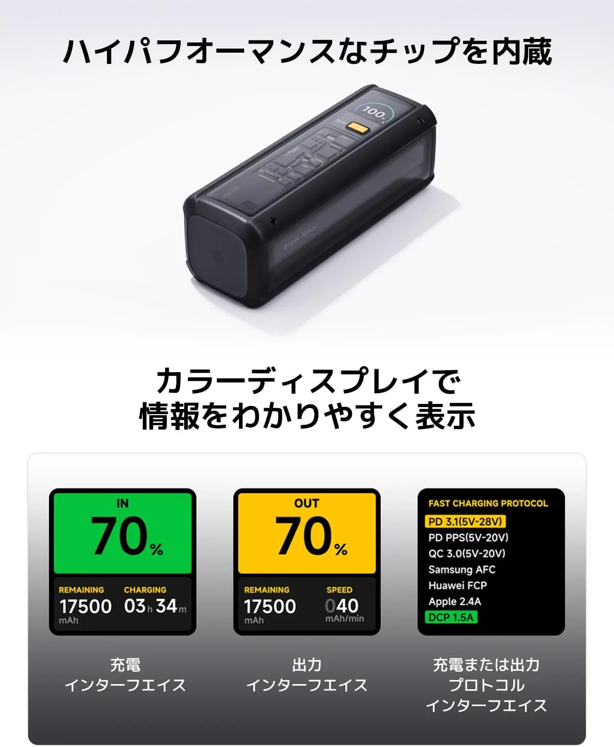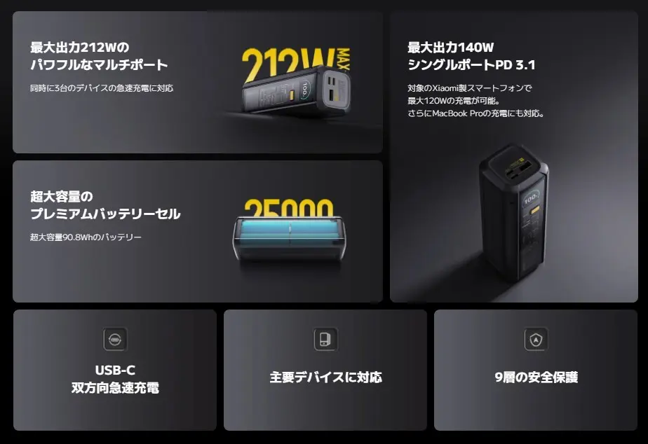 25,000mAhの大容量セルを内蔵したモバイルバッテリーであり、最大合計出力212Wのマルチポートを備え、3台のデバイスを同時に急速充電できるパワフルなモデルです。