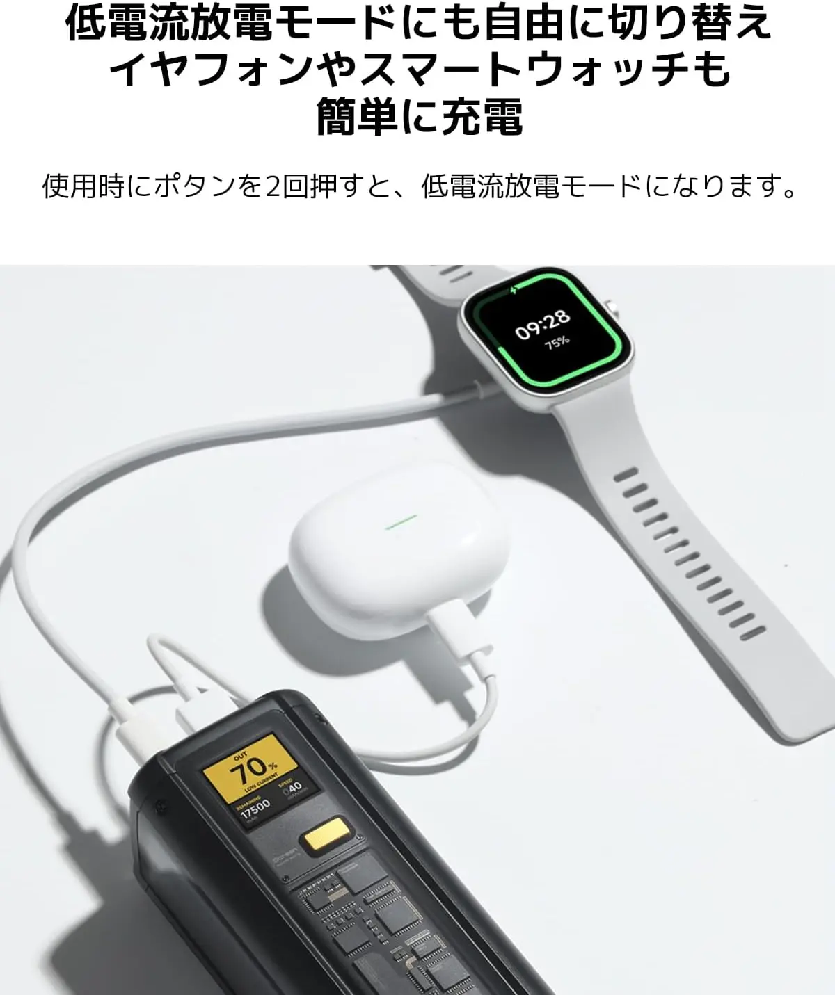 ボタンを2回押すことで、低電流放電モードに移行。イヤホンやスマートウォッチなど、低電流デバイスも安全に充電することが可能です。