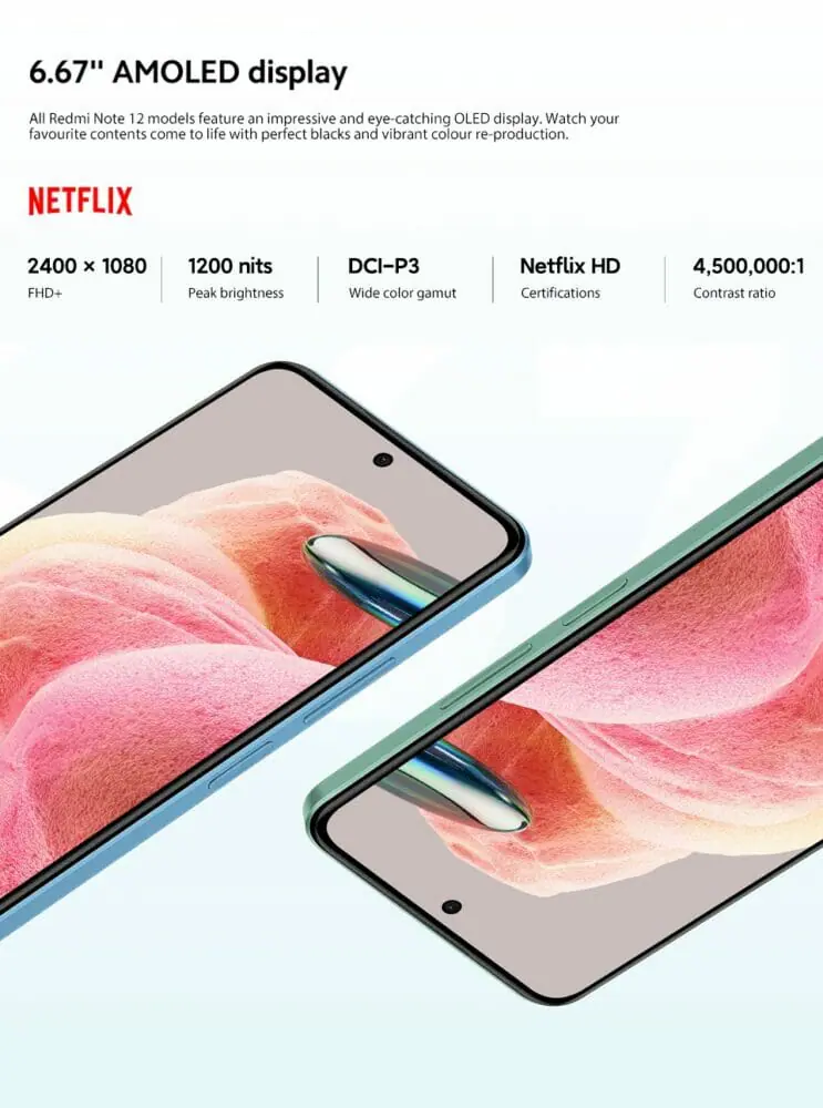 Redmi Note 12シリーズのデザインを引き継ぎ、Redmi Note 12は没入感のあるDotDisplayとスタイリッシュなフラットフレームを特徴とし、プレミアムなルックスと感触を提供しながら、長時間持ち運びが快適で耐久性に優れています。
