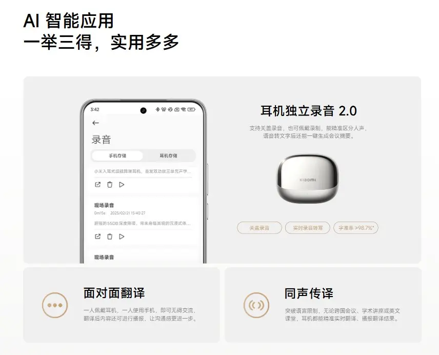 充電ケースを録音デバイスとして使用し、98.7%以上の文字変換精度で、会議録音やメモ作成する機能を用意。中国語・英語対応の「リアルタイム翻訳」といったAIスマート機能も備わっている。