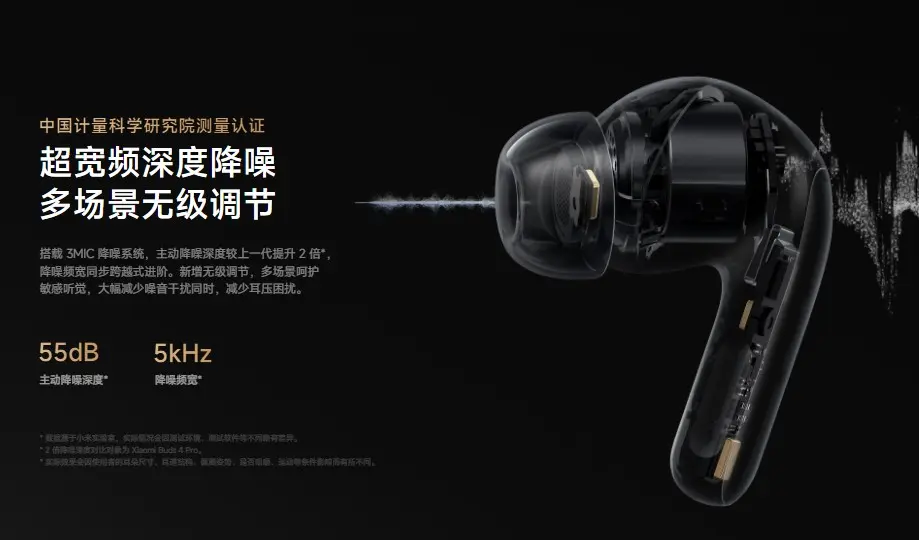 ▼前世代モデル(Xiaomi Buds 4 Pro)と比べて2倍ものノイズキャンセリング深度を実現。