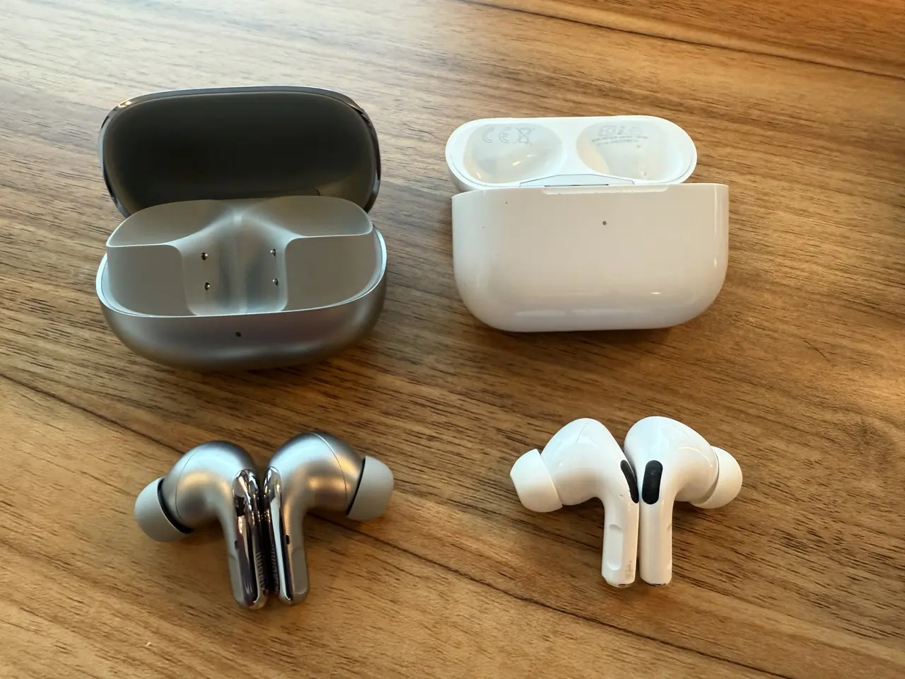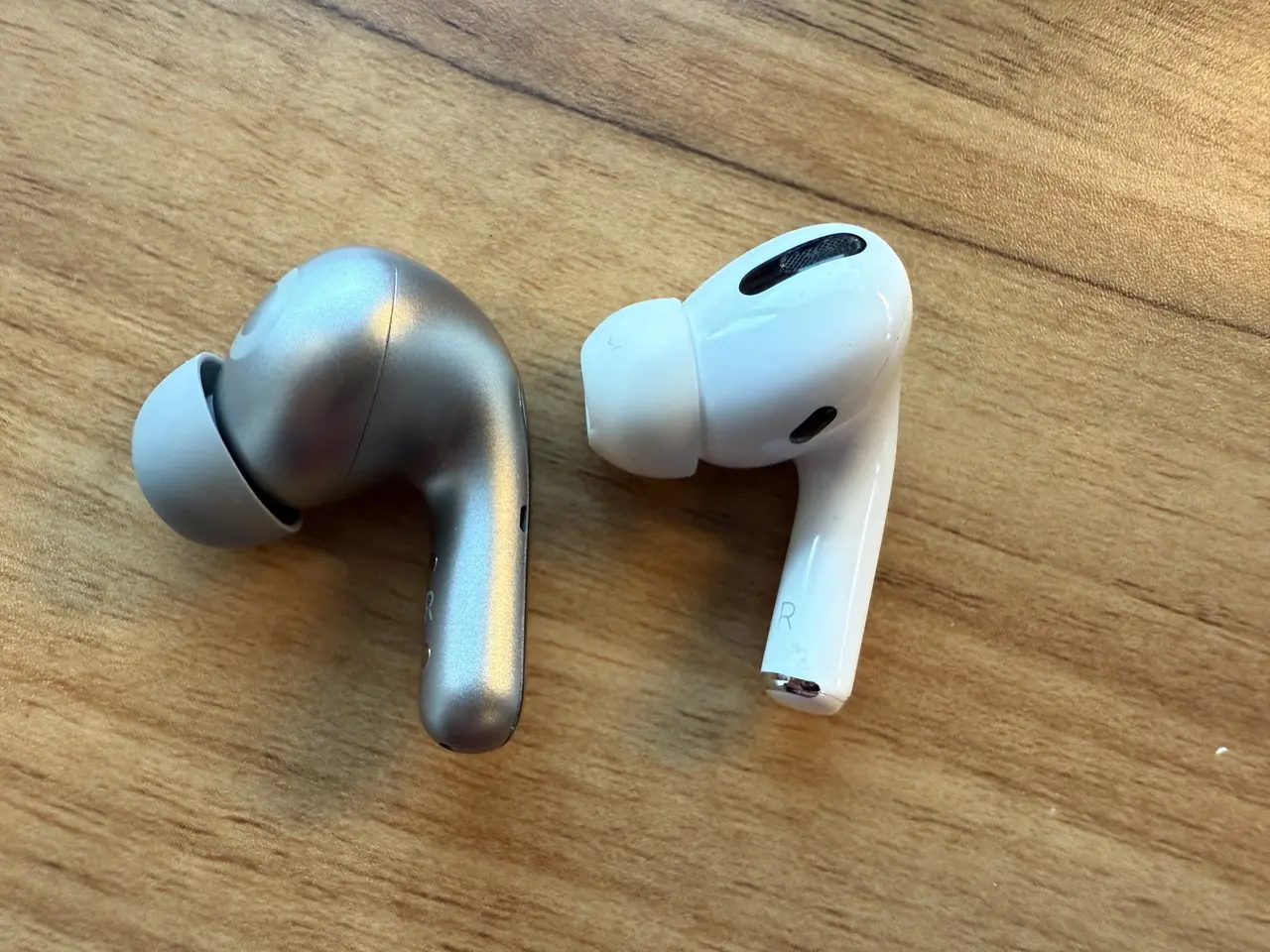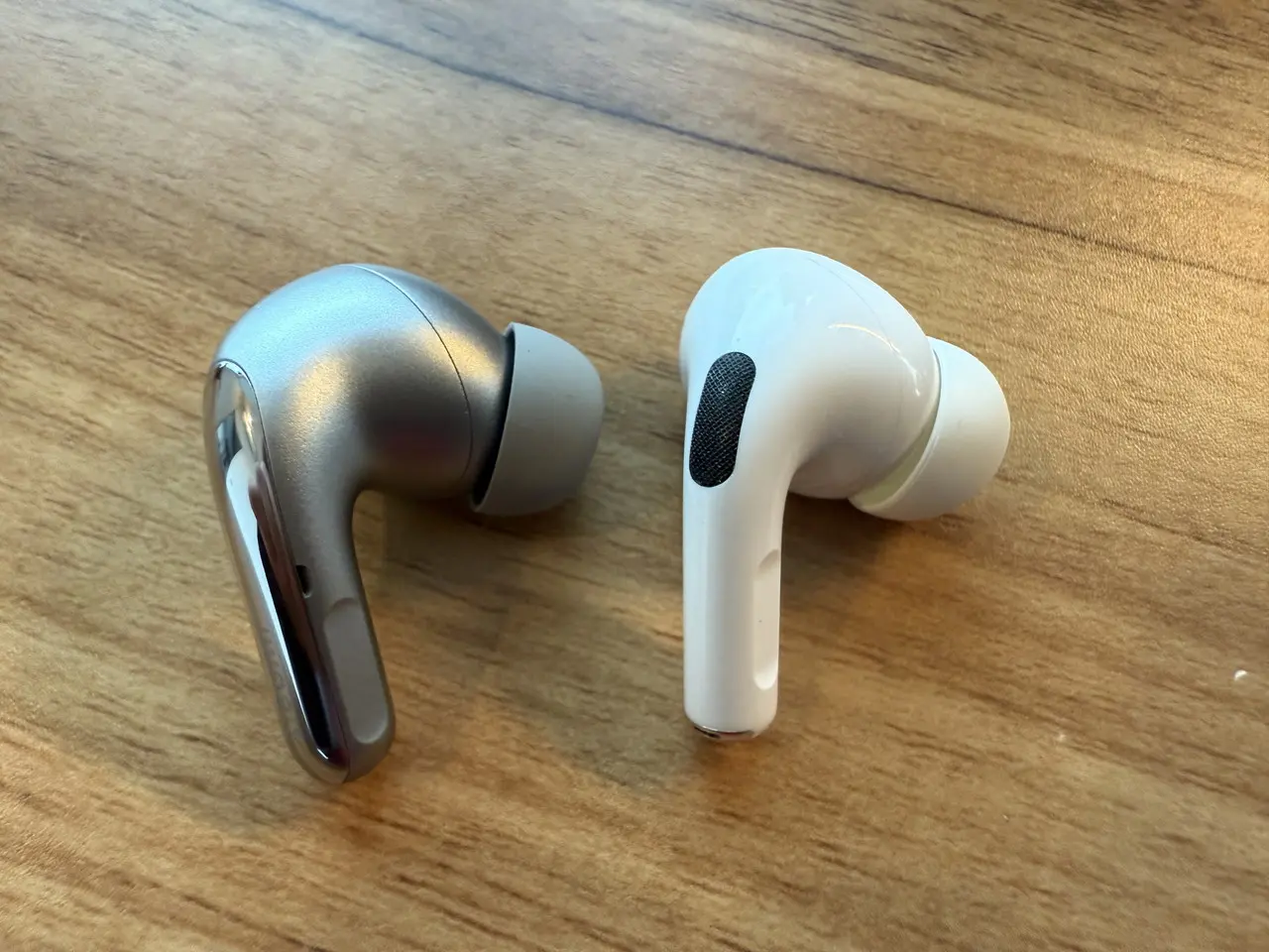▼『Xiaomi Buds 5 Pro』(画像左)と『AirPods Pro』(画像右)を並べた様子。