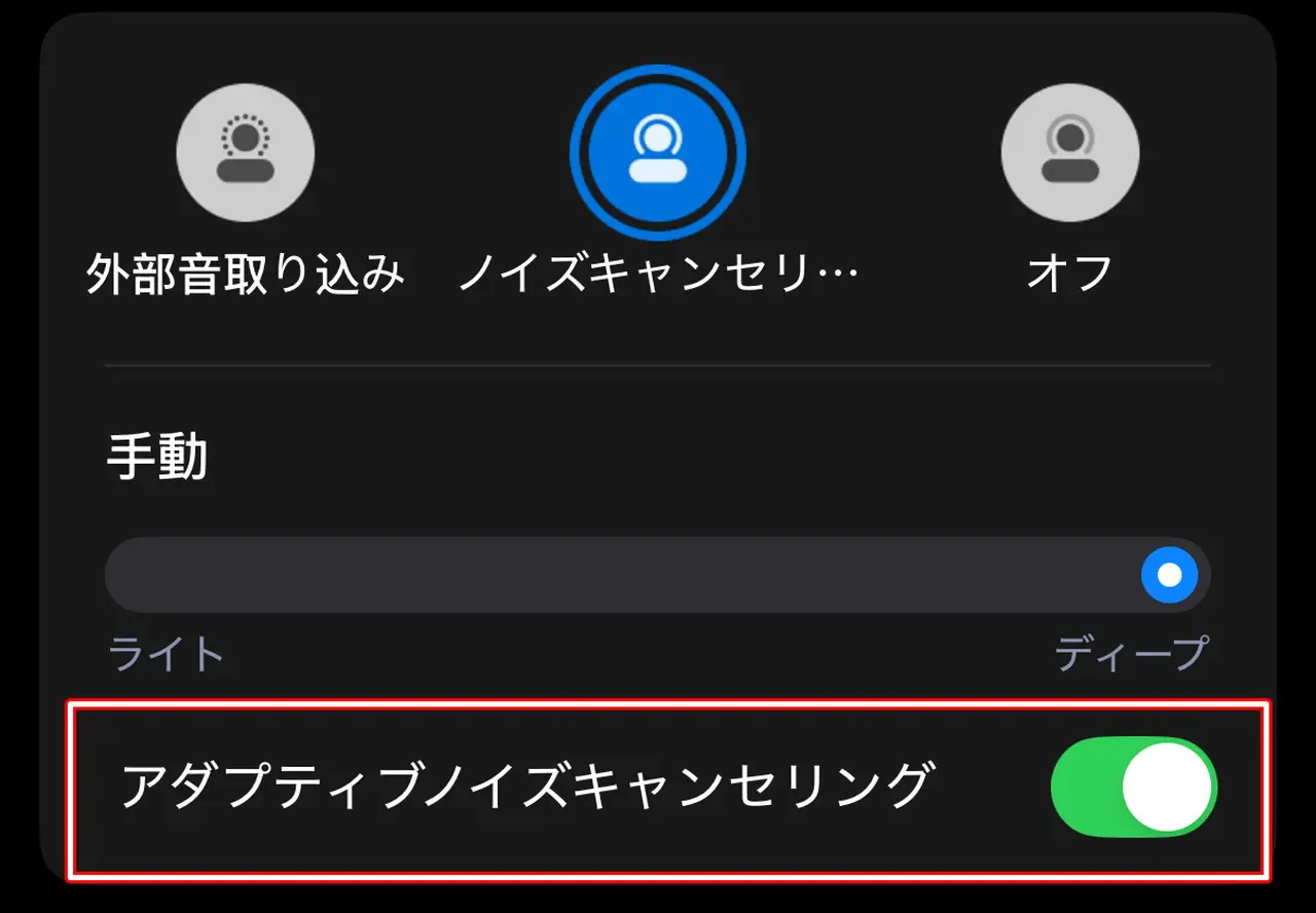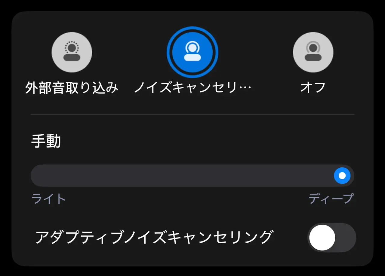 ノイズキャンセリングの強度は、手動で変更可能。最も強く設定する場合は、アダプティブノイズキャンセリングをOFFにする必要がある。