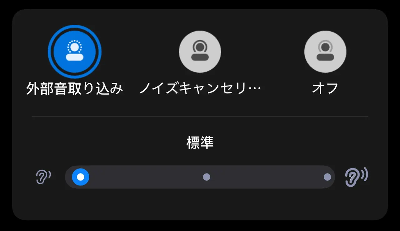 逆に、イヤホンを装着しつつ外部の音にも気を配りたい時のために、外部音取り込み機能も用意されている。