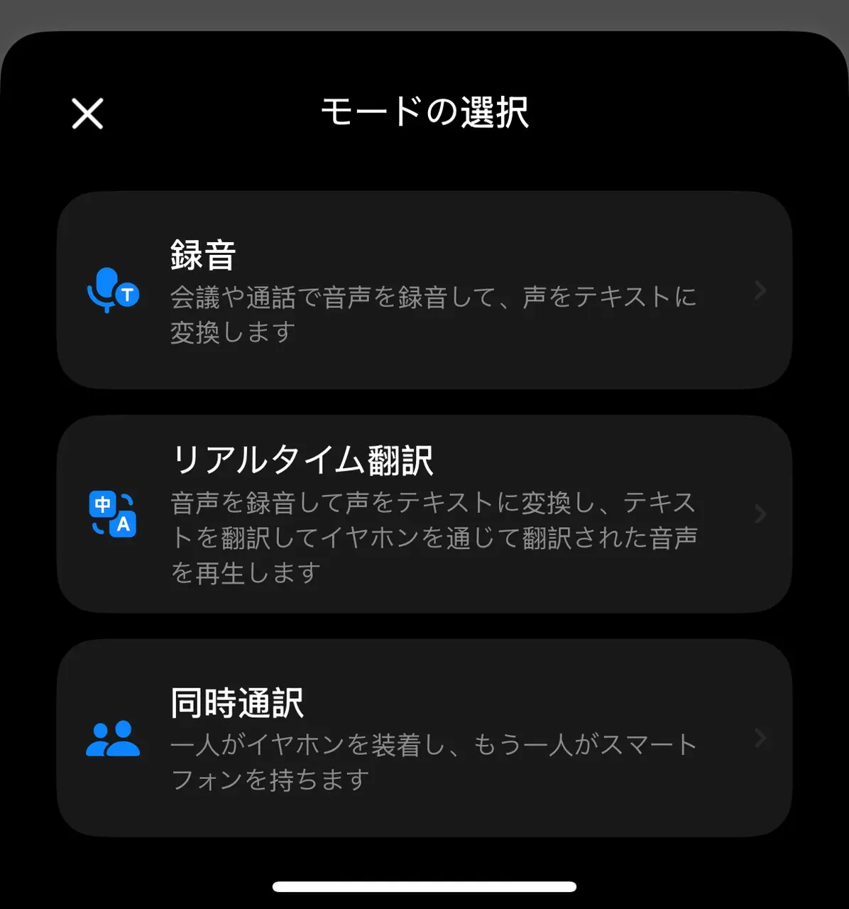 ▼録音・リアルタイム翻訳・同時通訳の3種類のモードから選択可能。