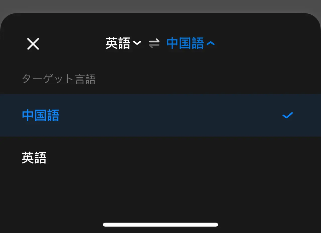 ▼モード選択後、翻訳するターゲット言語を指定する(今回のレビュー時には中国版を使用しているため、中国語・英語のみ選択可能であった)。