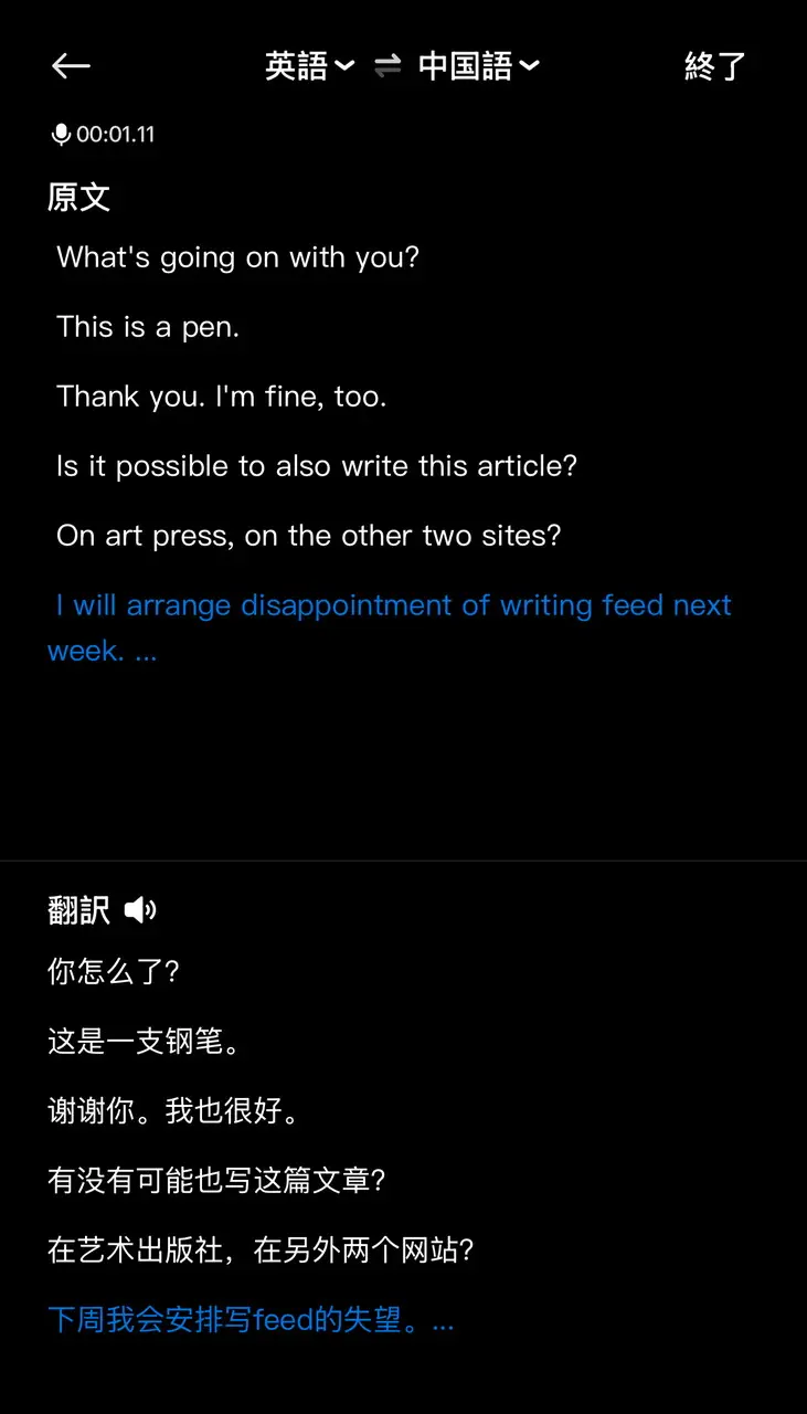 ▼リアルタイム翻訳&文字起こしの様子(中⇒英)