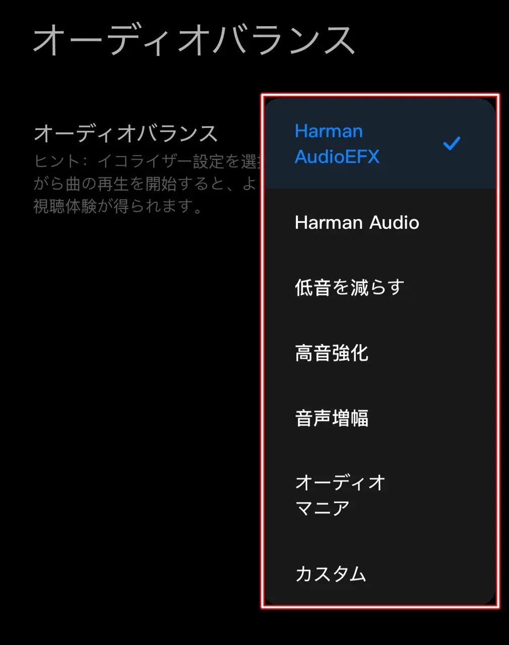 ▼オーディオバランスのプリセットが複数用意。サウンドの変化を手軽に楽しめる。