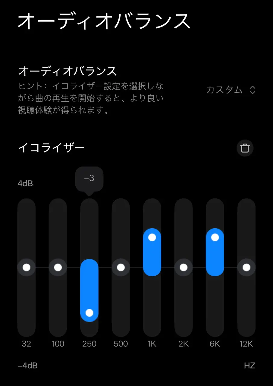 アプリにはオーディオバランスの調節機能が用意されており、イヤホンの音質を自分好みにカスタマイズすることが出来る。