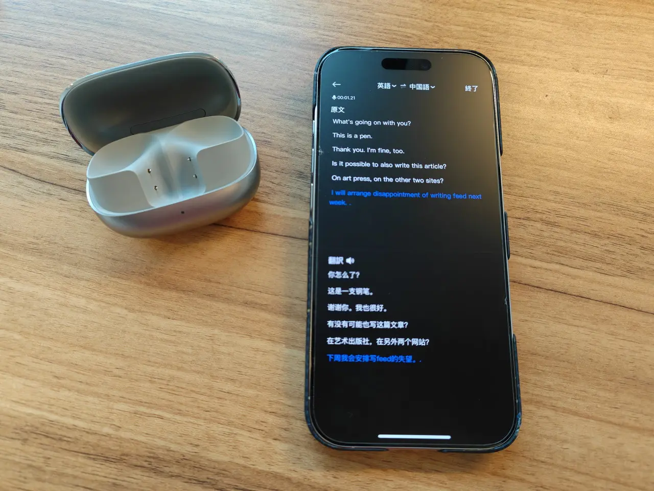翻訳を開始すると、拾い上げた言葉がリアルタイムにターゲット言語へ翻訳され、アプリ上に文字起こしされると同時に、翻訳語の音声がイヤホンから流れてくる。