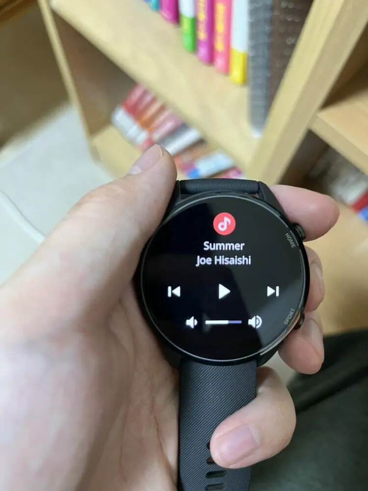 ▼音楽再生機能です。再生、スキップ、音量調節がMi Watchから可能です。