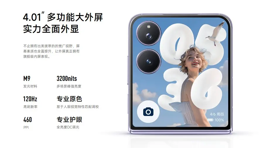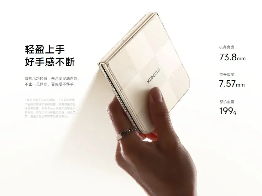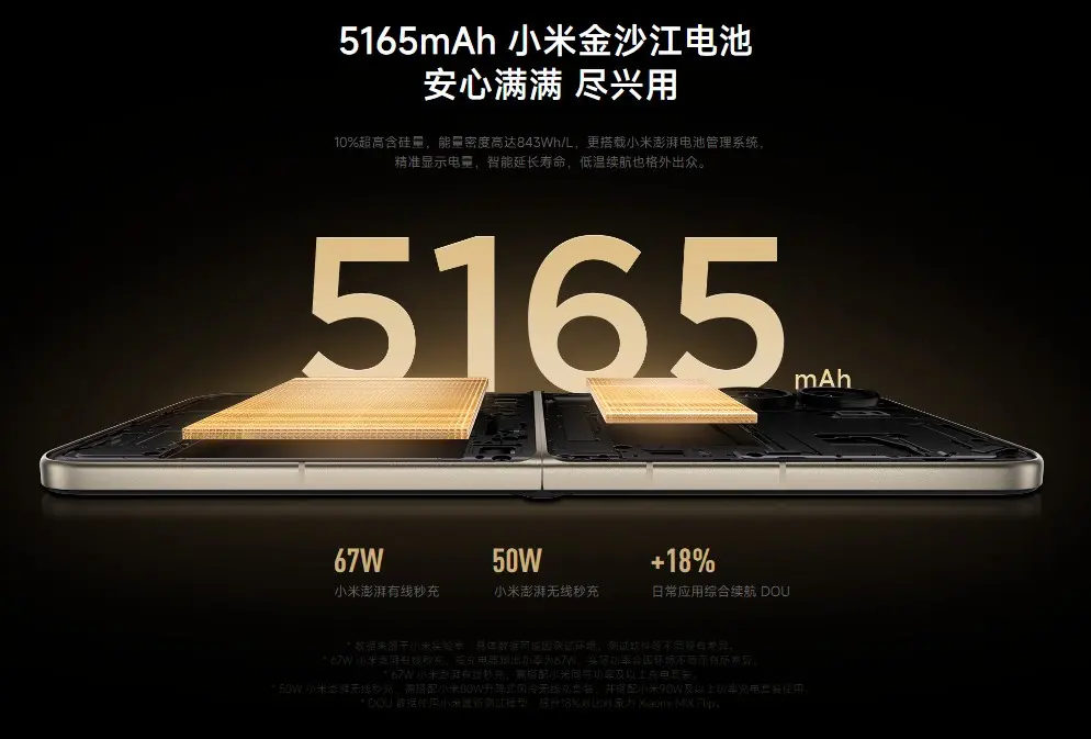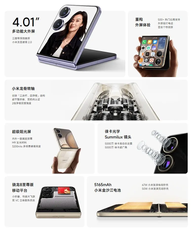 内外ともにフラッグシップ級のディスプレイを搭載。新開発の「小米龍骨ヒンジ2.0」を採用しており、20万回の折りたたみに耐えられるほか、折り目の目立たなさにも定評があるとのこと。