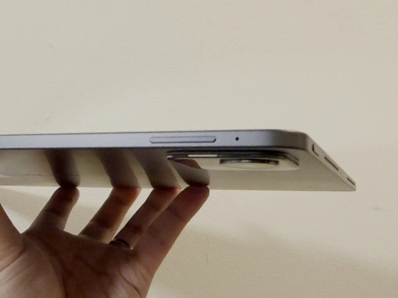 ▼iPhone 16 Pro(白)との厚みの比較。iPhone 16 Pro(厚さ8.25mm)と比べると、Xiaomi Pad 7 Ultraの薄さが際立つ。