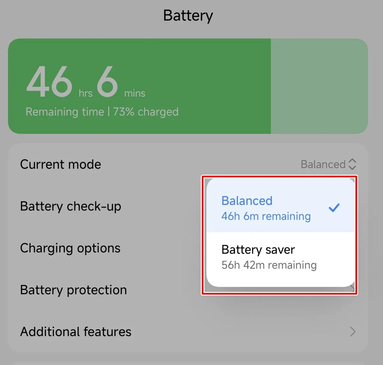 ▼バッテリーセーバーモードに変更することで、より長時間の連続使用が可能となる。