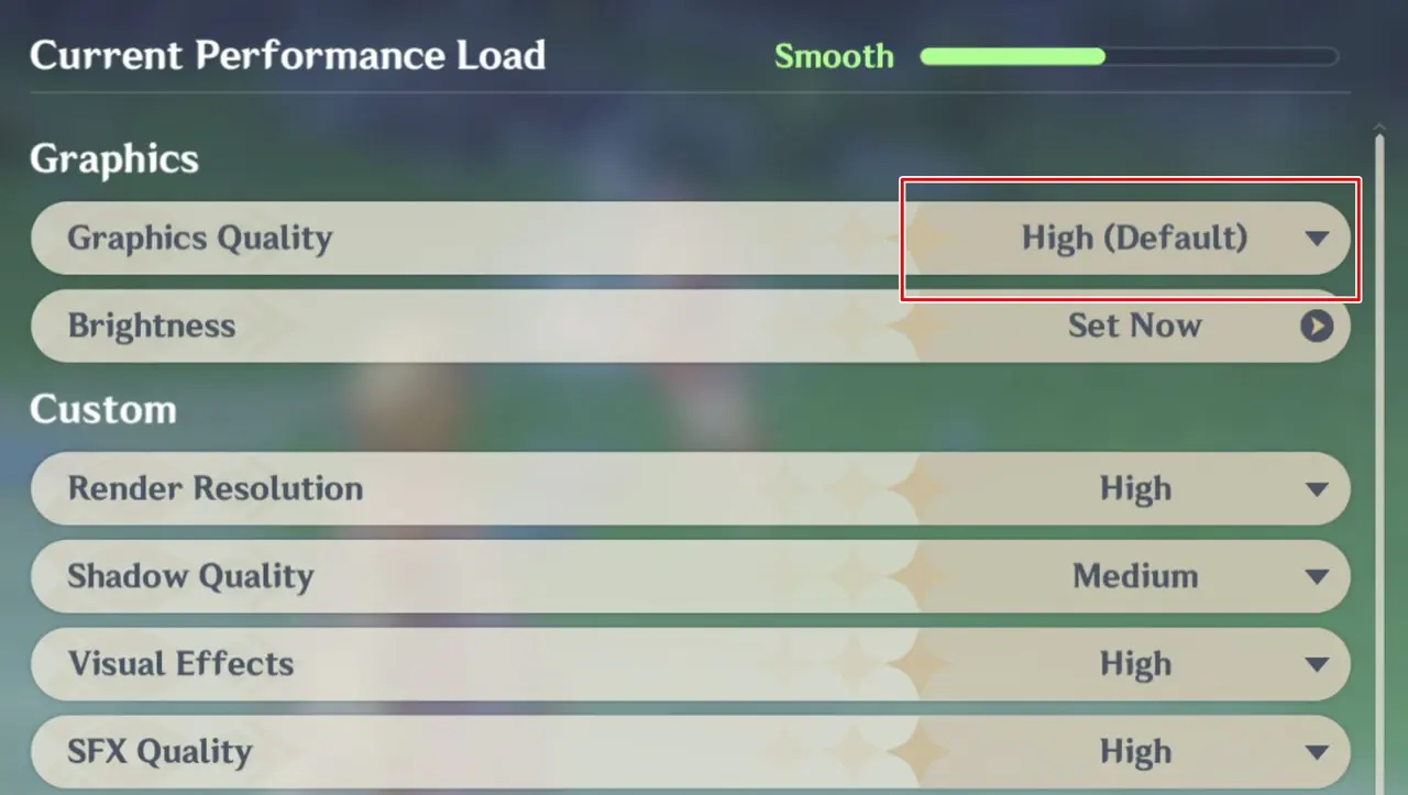 ▼画質設定はデフォルト状態で "High(高)" に設定されており、デバイス負荷は "スムーズ" の状態。