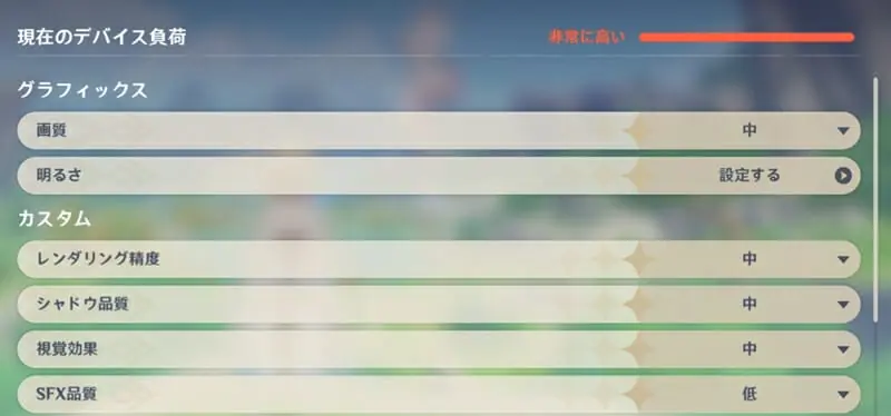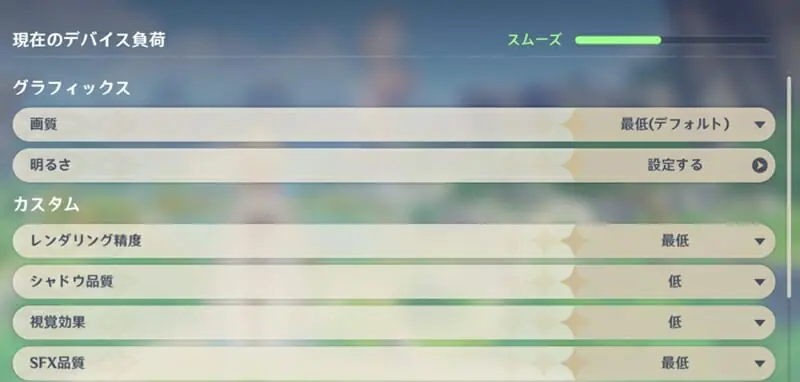 ▼画質設定はデフォルト状態で "最低" に設定されており、デバイス負荷は "スムーズ" の状態。