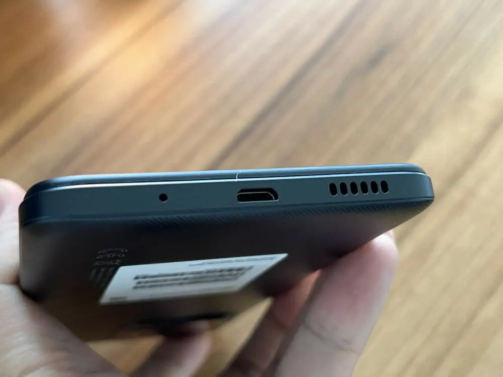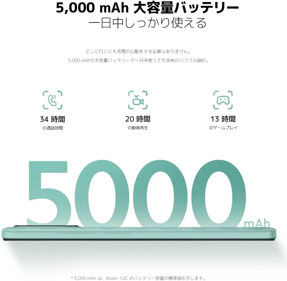バッテリー容量は5,000mAh。一般的なスマホと比べて大容量となっている一方で、Redmi 12CはType-Cポートではなく「micro USBポート」を搭載。10Wでしか充電できないのがネックだ。