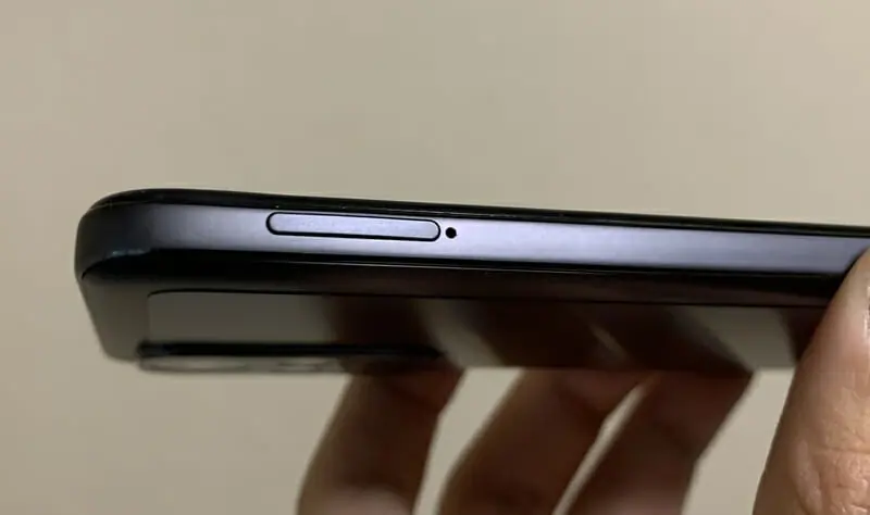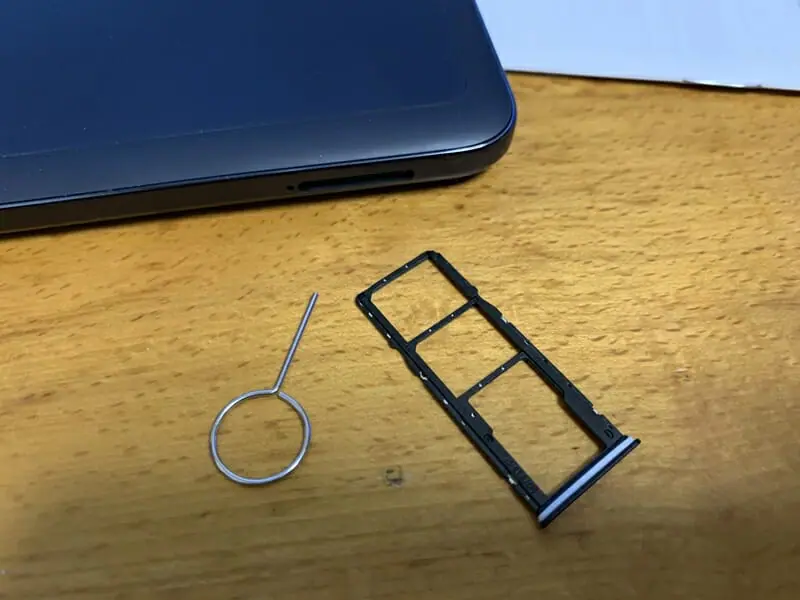 ▼付属のピンを利用してスロットを開き、デュアルnanoSIMカード、およびマイクロSDカードの挿入が可能。