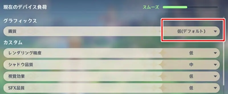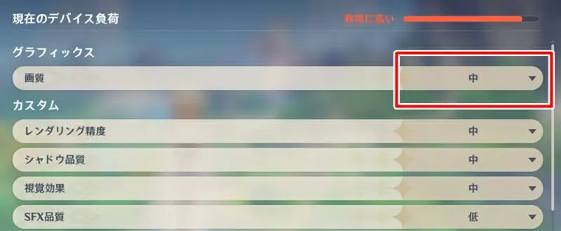 ▼画質を "中" 以上に上げると、カクつきやフレームレート低下が顕著に発生する。