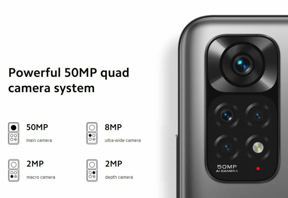 前面には8MPのフロントカメラを、背面には50MPメインカメラ + 8MP広角カメラ+ 2MPマクロカメラ + 2MP深度カメラを内蔵しており、風景から近接撮影まで鮮明な写真を撮ることが出来る。