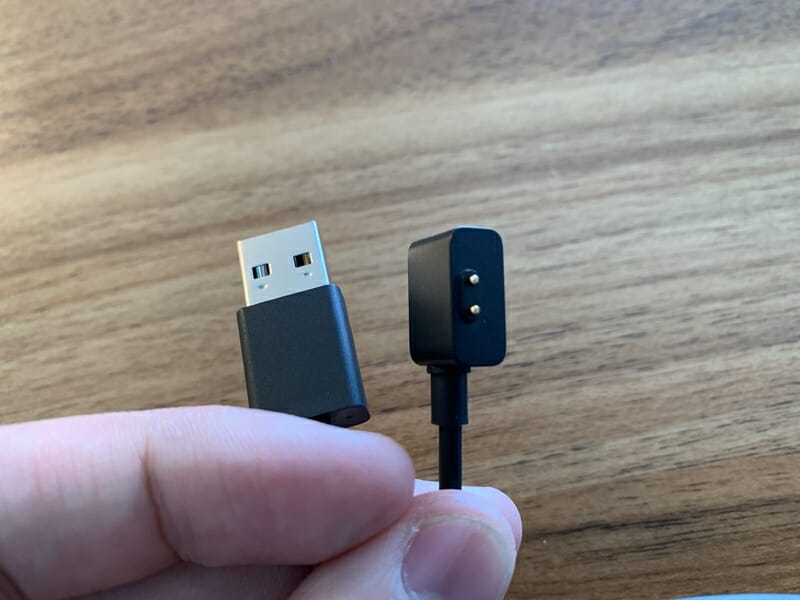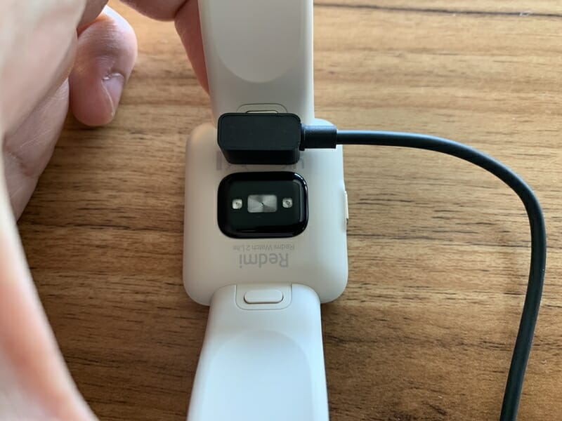 充電の際は、スマートウォッチ背面のポートにケーブル端子を近づけるだけでカチッと磁石で吸着し、充電が開始される。