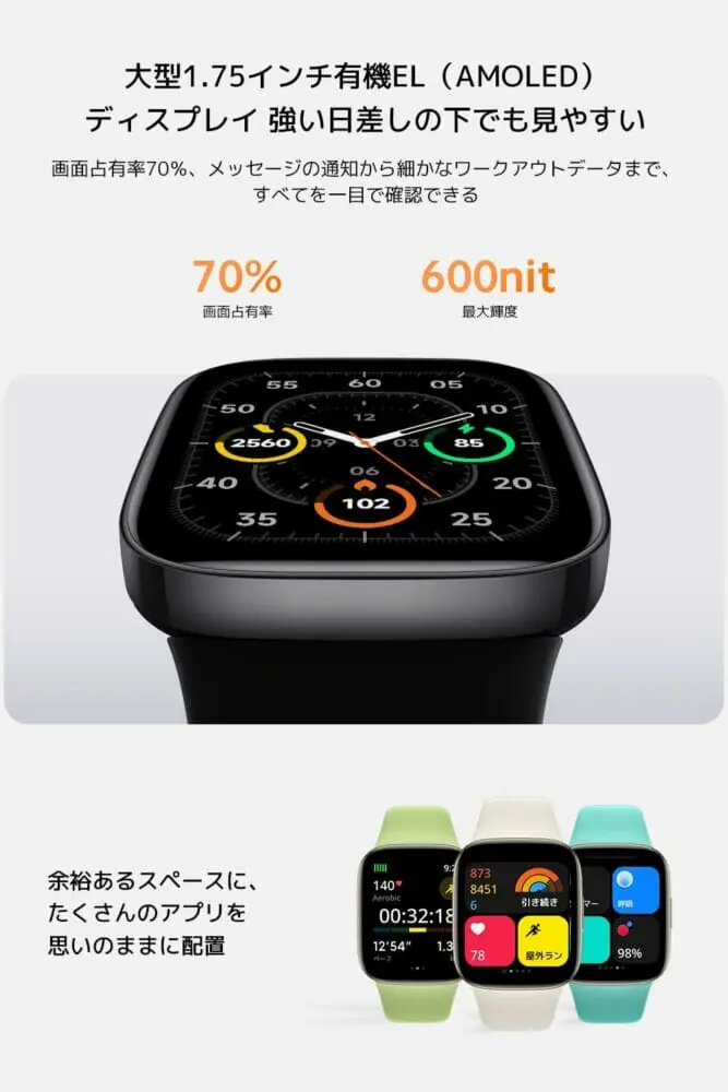 1.75インチ有機EL搭載、マイク&スピーカー内蔵で通話機能にも対応。最大12日間持続するバッテリーを内蔵するなど、全体的に完成度の高い高機能スマートウォッチとなっている。