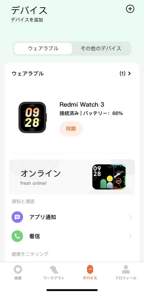 アプリ(スマホ・タブレット端末)とのペアリングが完了すると、端末上でスマートウォッチの状態を確認したり、データの分析や機能のカスタマイズなどを行うことが可能となる。