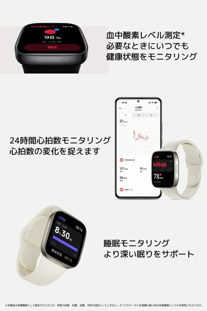 血中酸素測定や睡眠モニタリング機能をはじめとした多くの健康管理ツールが用意されており、普段から自然と健康を意識出来るようになる。「Zepp Life」や「ヘルスケア」など、サードパーティから過去のデータを転送(共有)できるため、ウォッチの乗り換え時にも安心だ。