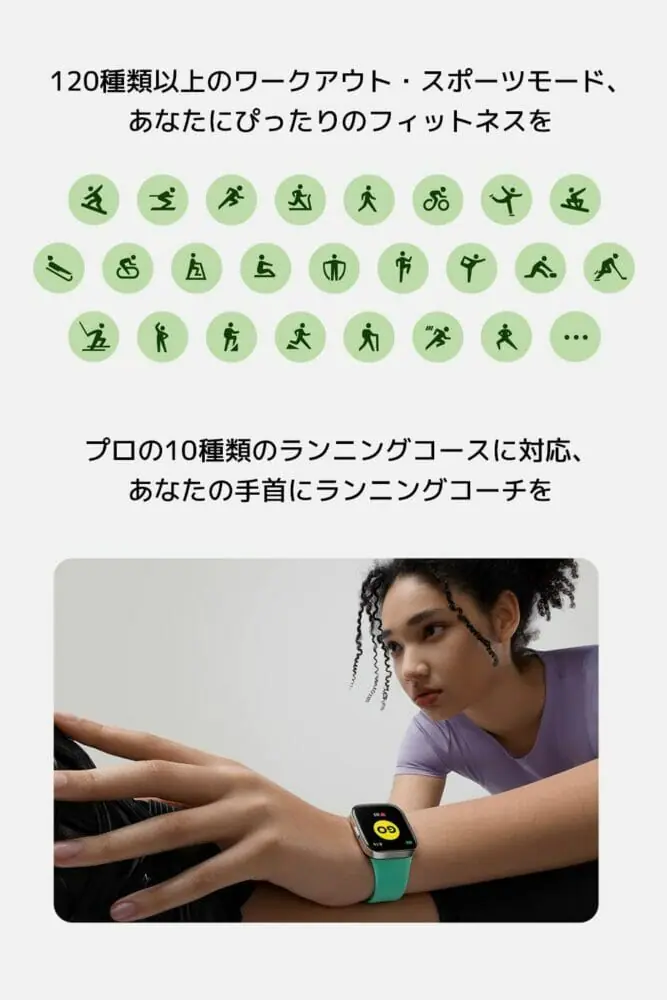 本製品はウォーキング、ランニング、サイクリング、ウェイトリフティング、水泳など、120以上のスポーツモードに対応している。