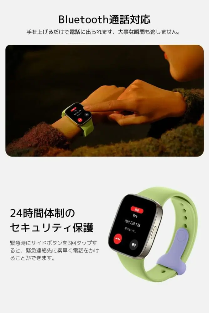 本製品にはマイク&スピーカーが内蔵されており、スマホとBluetooth連携することで、スマートウォッチ上から音声通話を行うことも可能となっている。