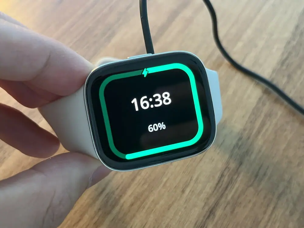充電の際は、スマートウォッチ背面のポートにケーブル端子を近づけるだけでカチッと磁石で吸着し、充電が開始される。