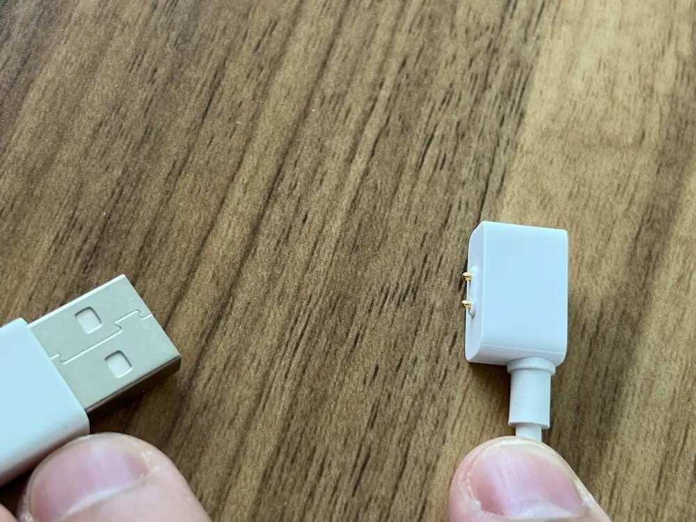 充電の際は、スマートバンド背面のポートにケーブル端子を近づけるだけでカチッと磁石で吸着し、充電が開始される。